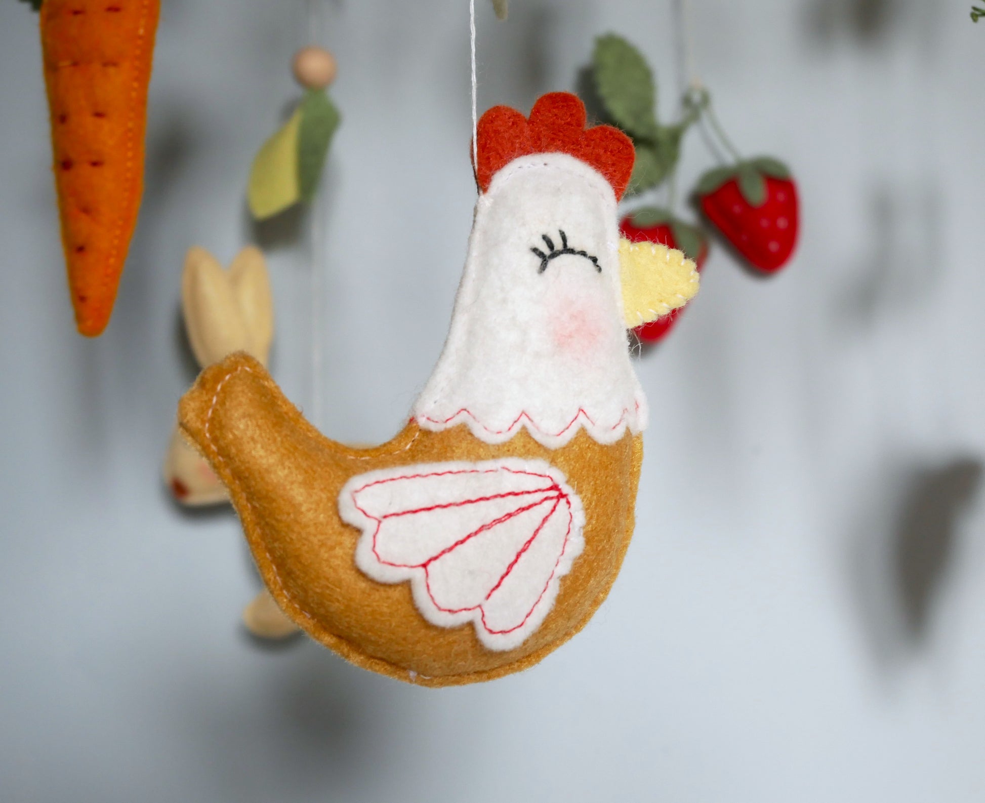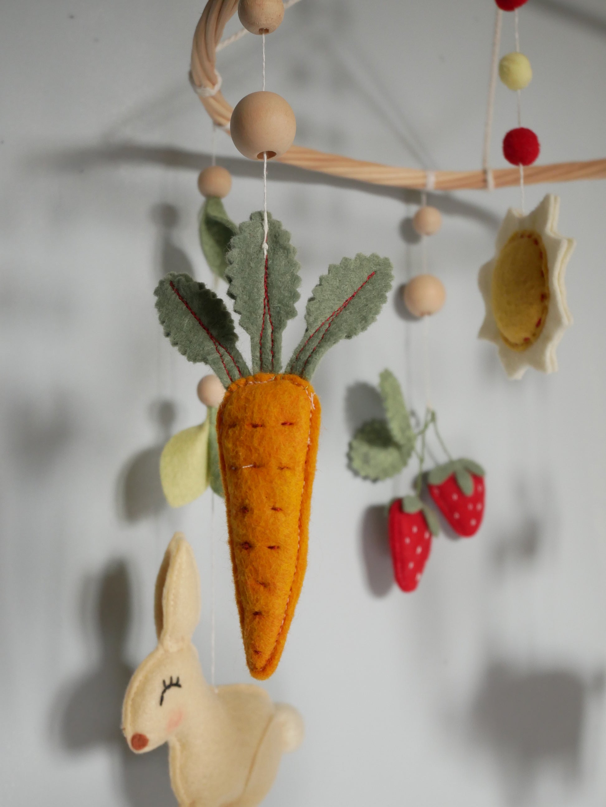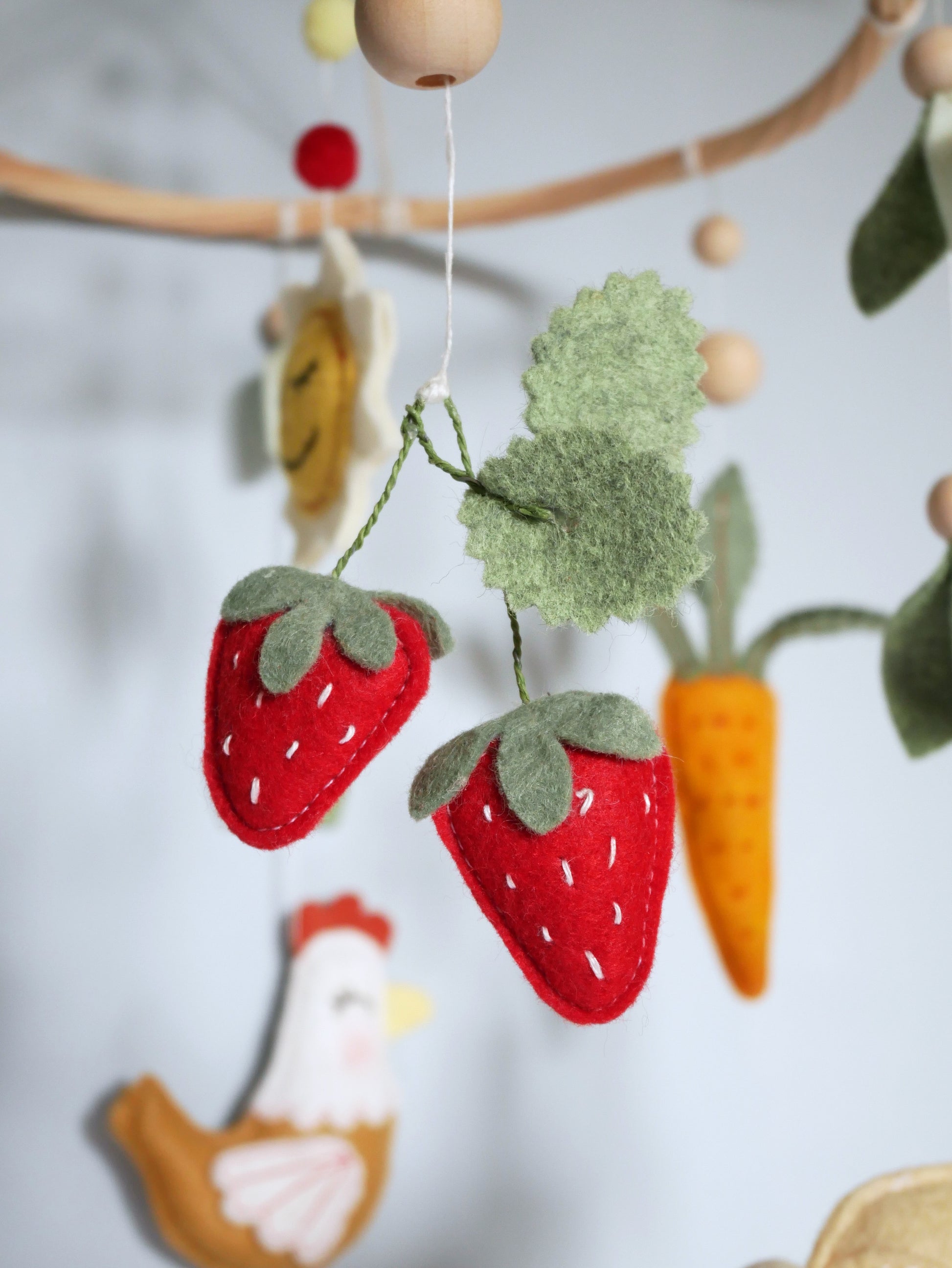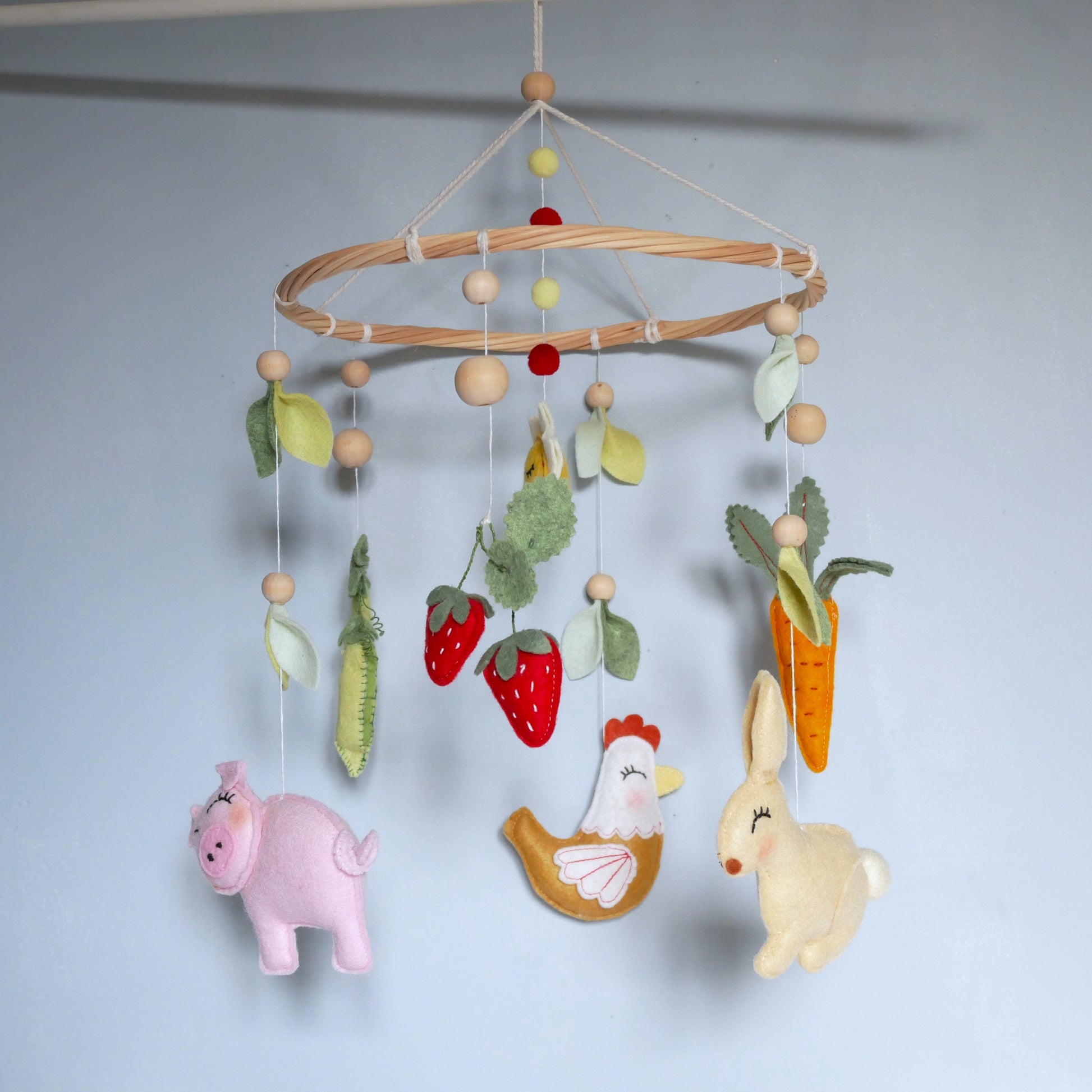 Mobile artisanal conçu pour éveiller les sens des tout-petits. Cet ensemble combine des figurines en feutrine représentant les animaux de la ferme et des fruits et légumes colorés, suspendus à une structure en rotin naturel. Chaque élément est fait main. Parfait pour stimuler la curiosité visuelle du bébé tout en créant une ambiance douce et naturelle dans la chambre.