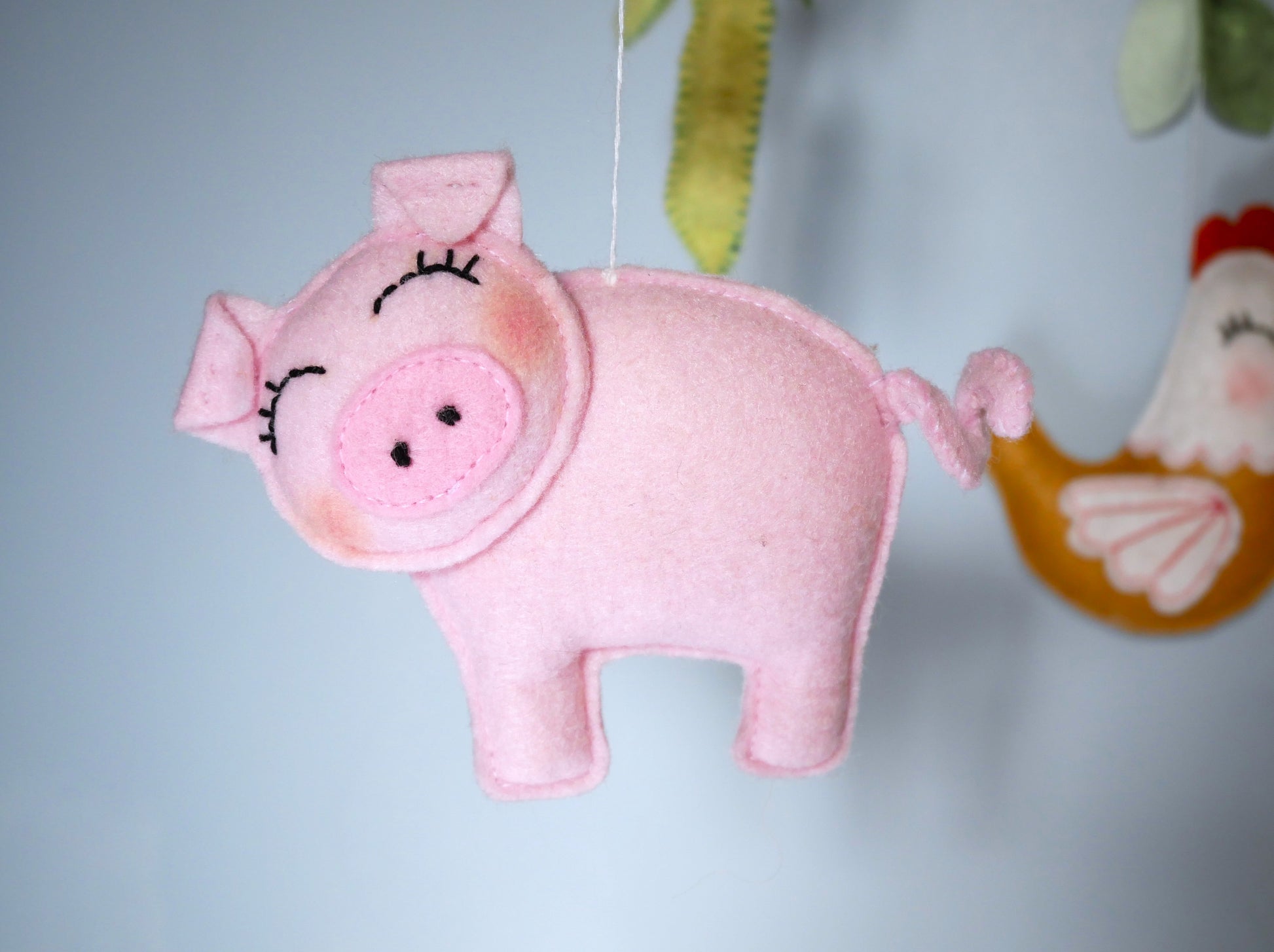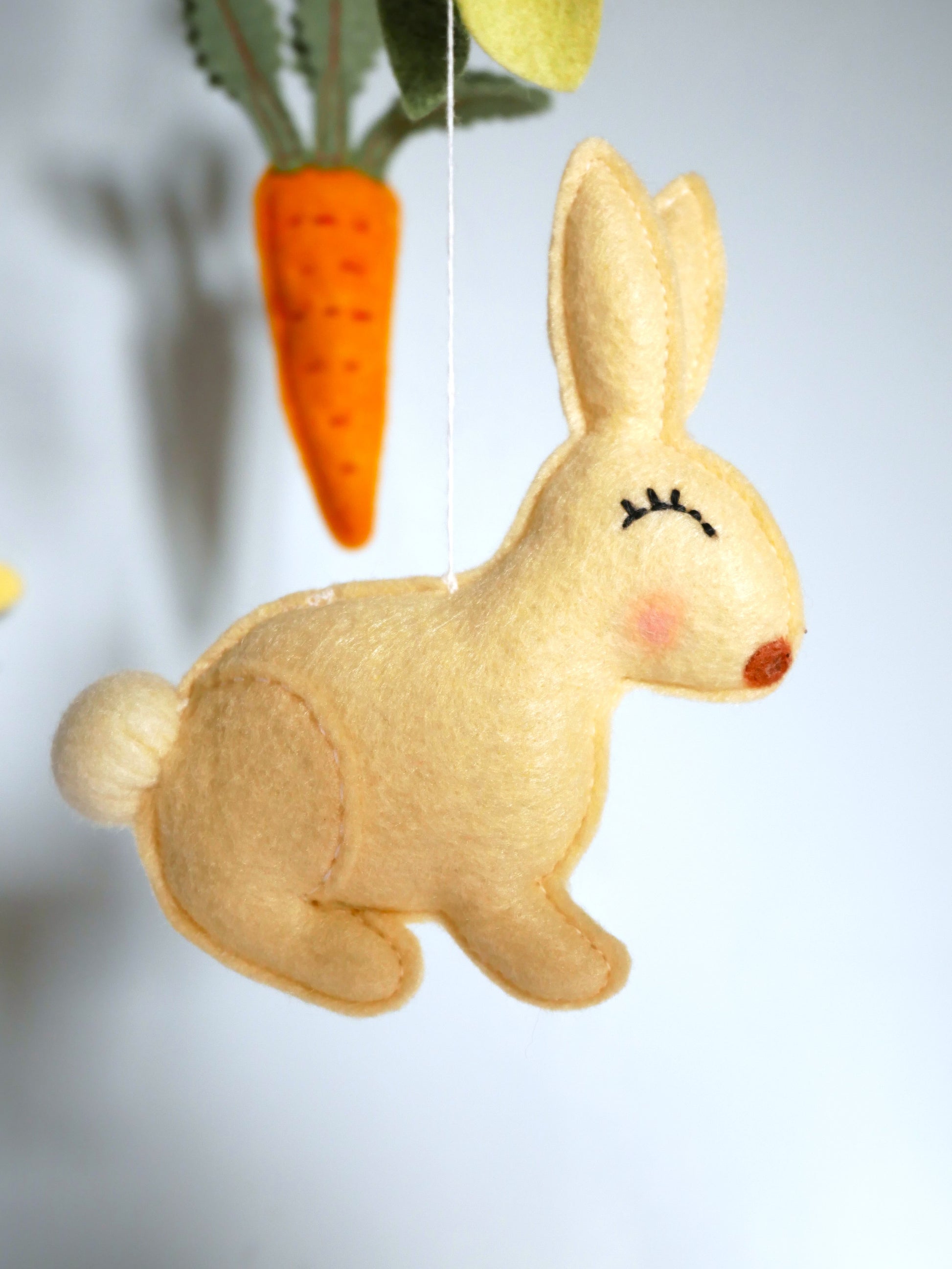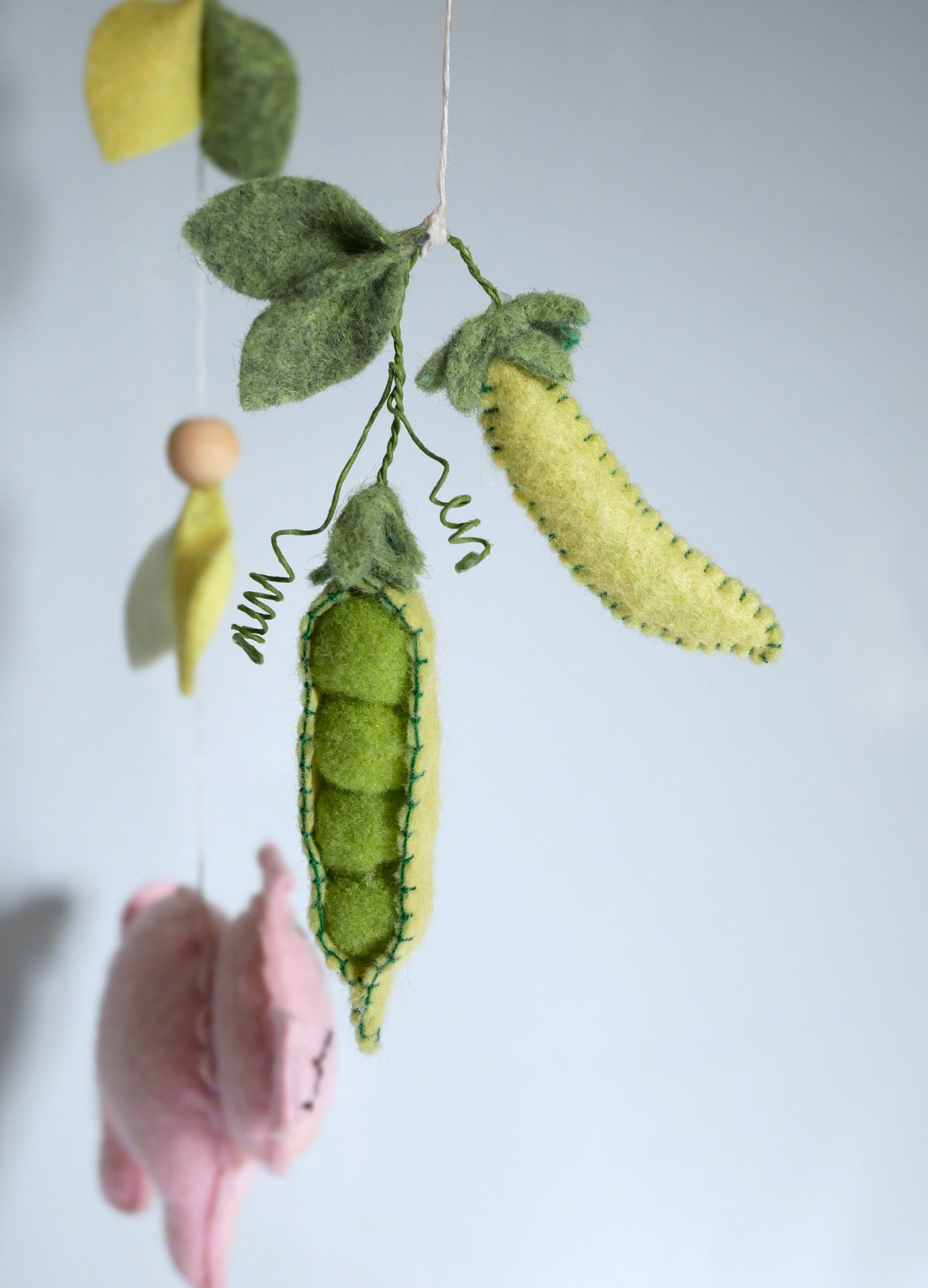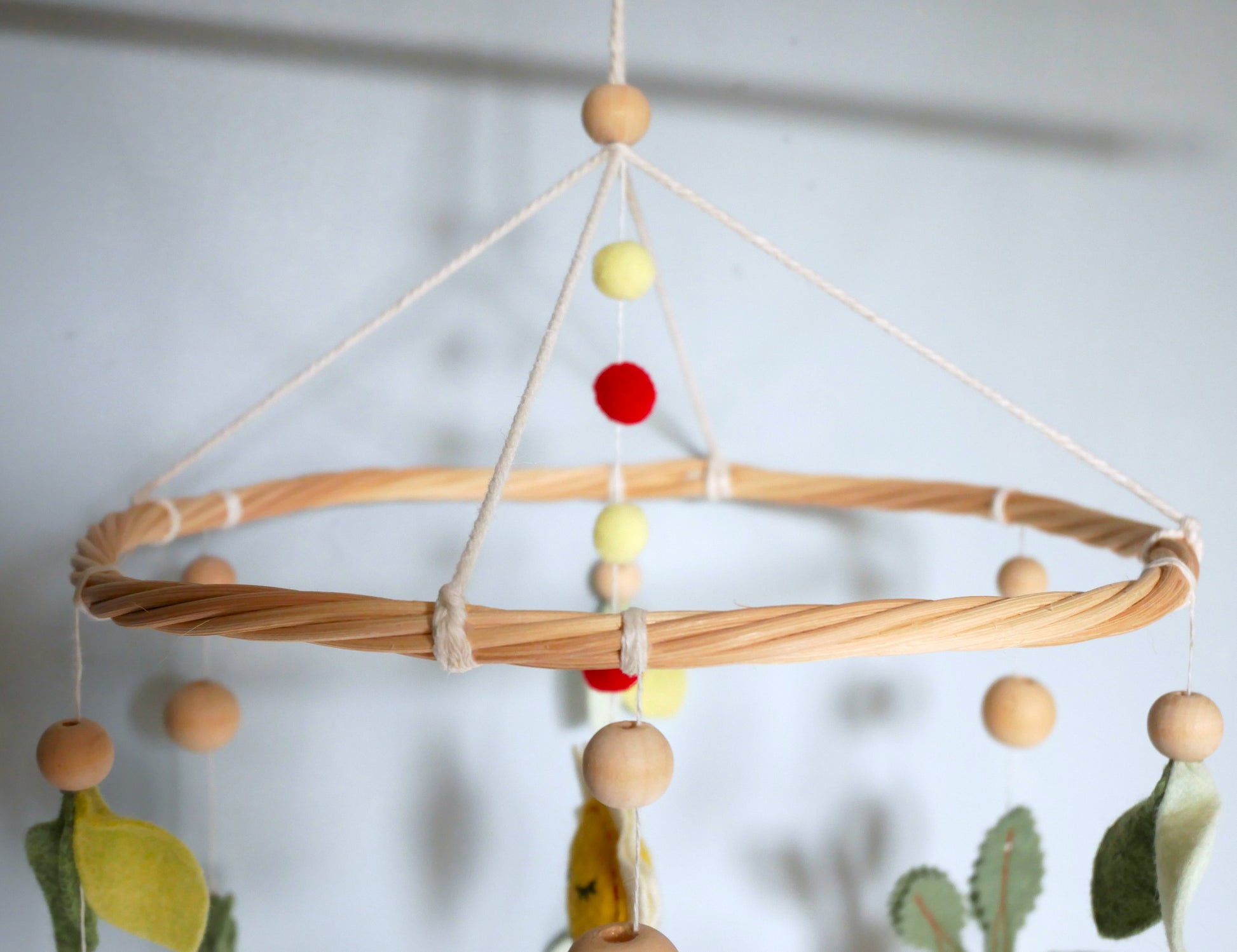Mobile artisanal conçu pour éveiller les sens des tout-petits. Cet ensemble combine des figurines en feutrine représentant les animaux de la ferme et des fruits et légumes colorés, suspendus à une structure en rotin naturel. Chaque élément est fait main. Parfait pour stimuler la curiosité visuelle du bébé tout en créant une ambiance douce et naturelle dans la chambre.