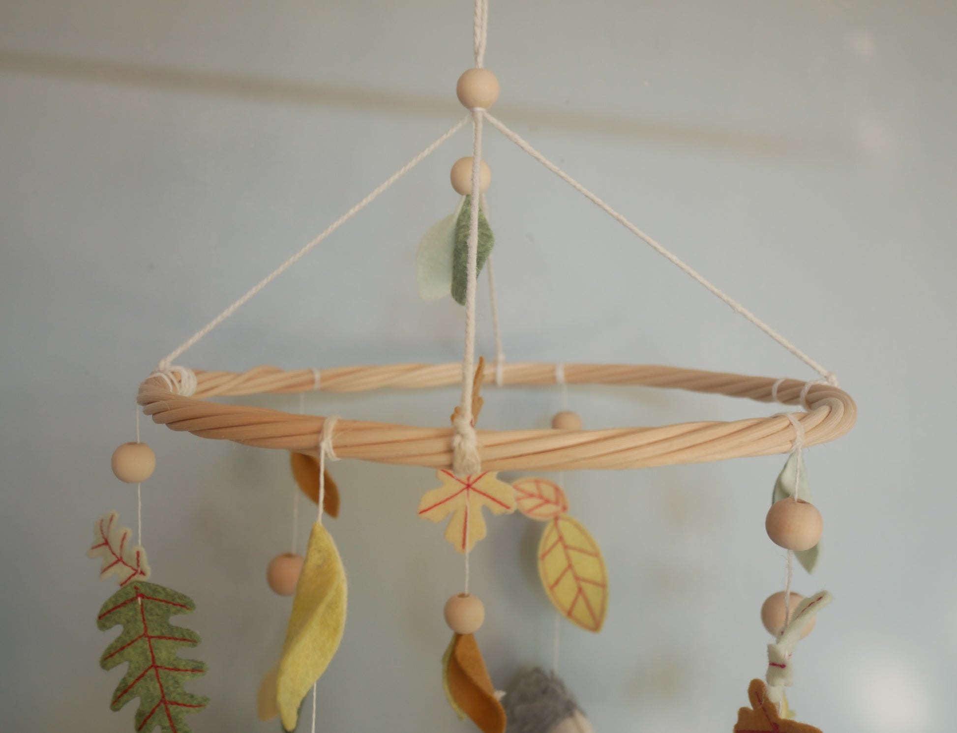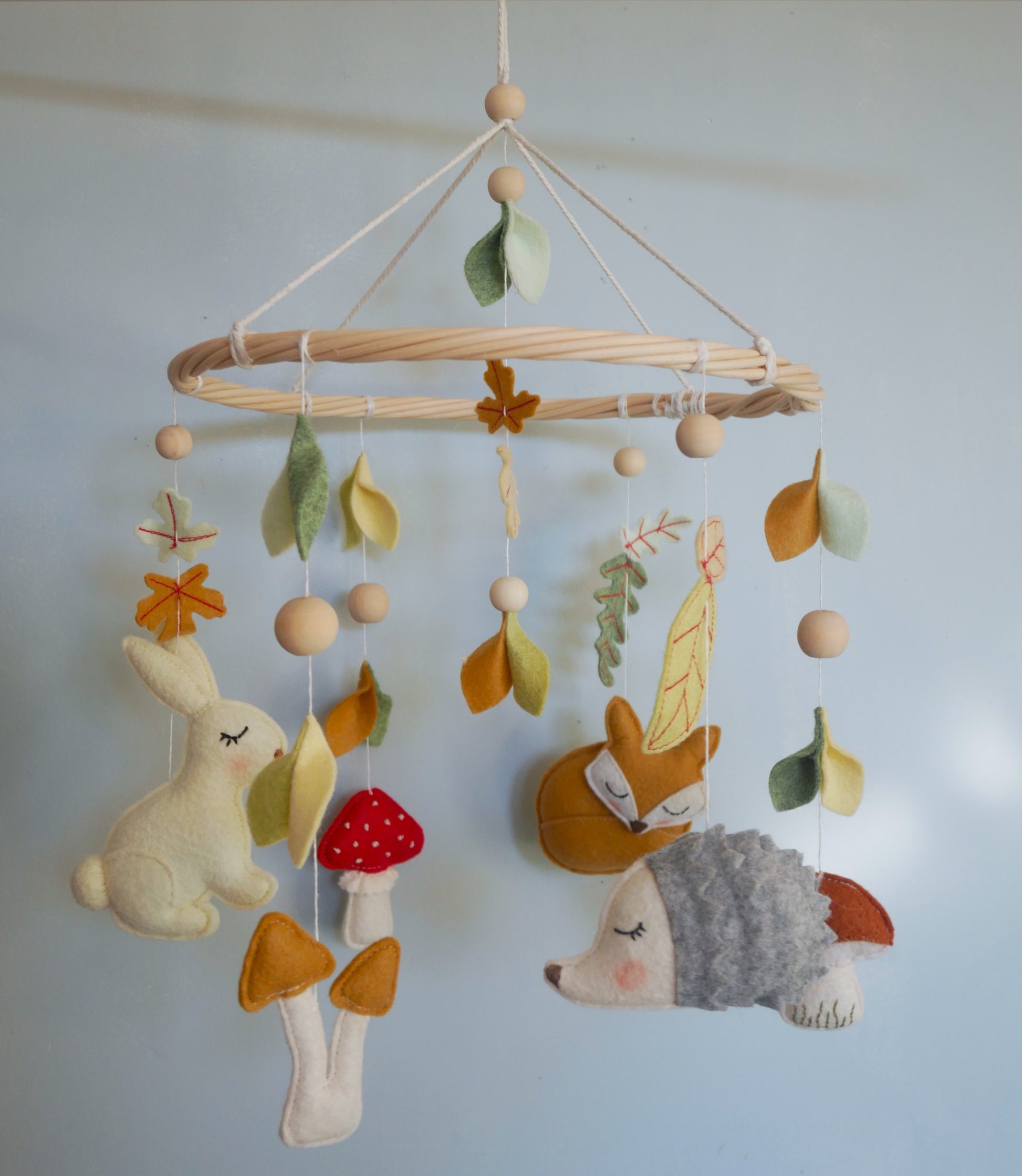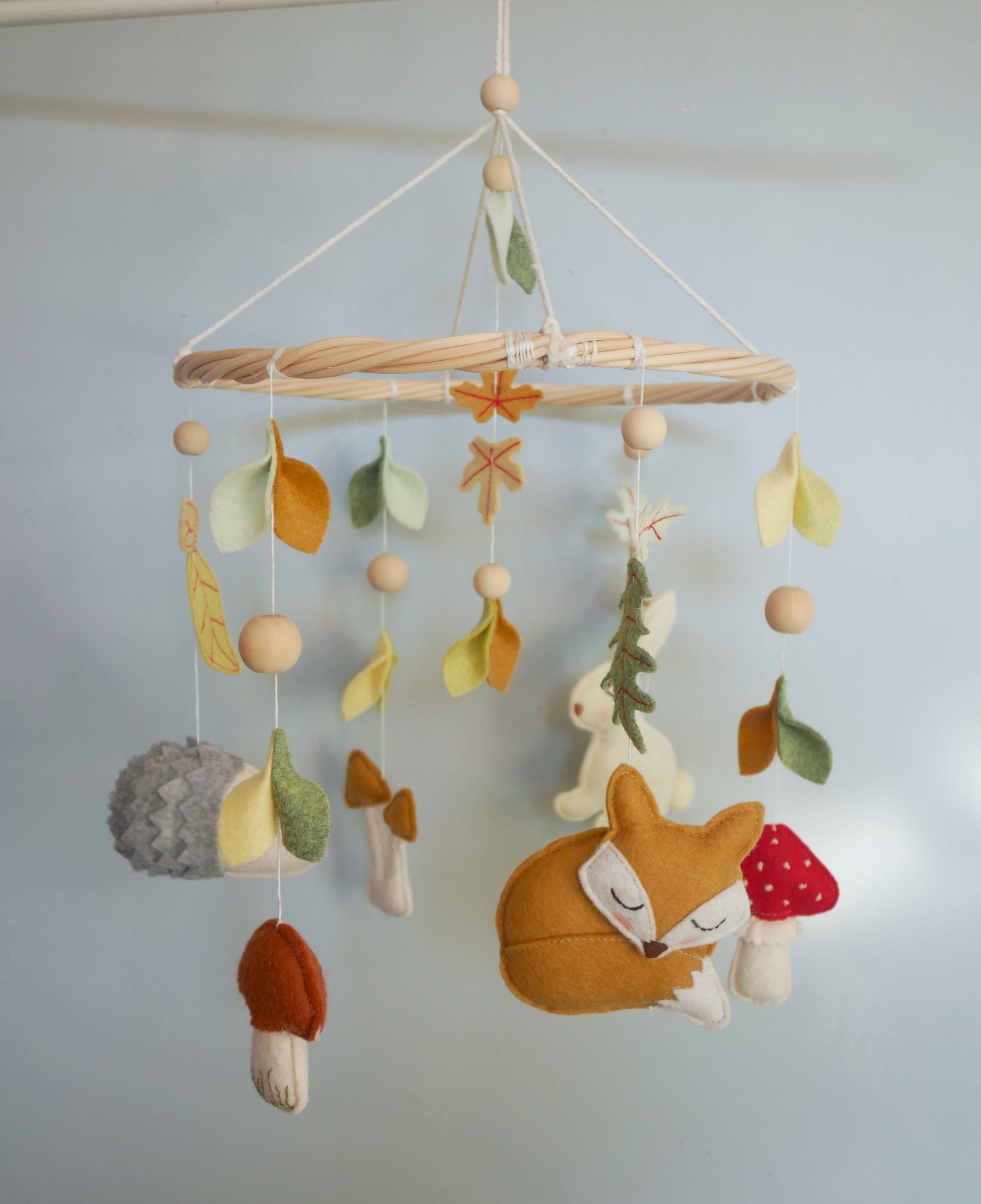 Mobile pour chambre de bébé. Fait main en feutrine et rotin sur le thème de la forêt et ses animaux. Les éléments suspendus, assemblés sur une structure en rotin naturel, créent un équilibre visuel apaisant au-dessus du lit ou de l'espace de change. Ce mobile stimule la curiosité visuelle du nourrisson tout en s'intégrant harmonieusement à une décoration douce et naturelle.