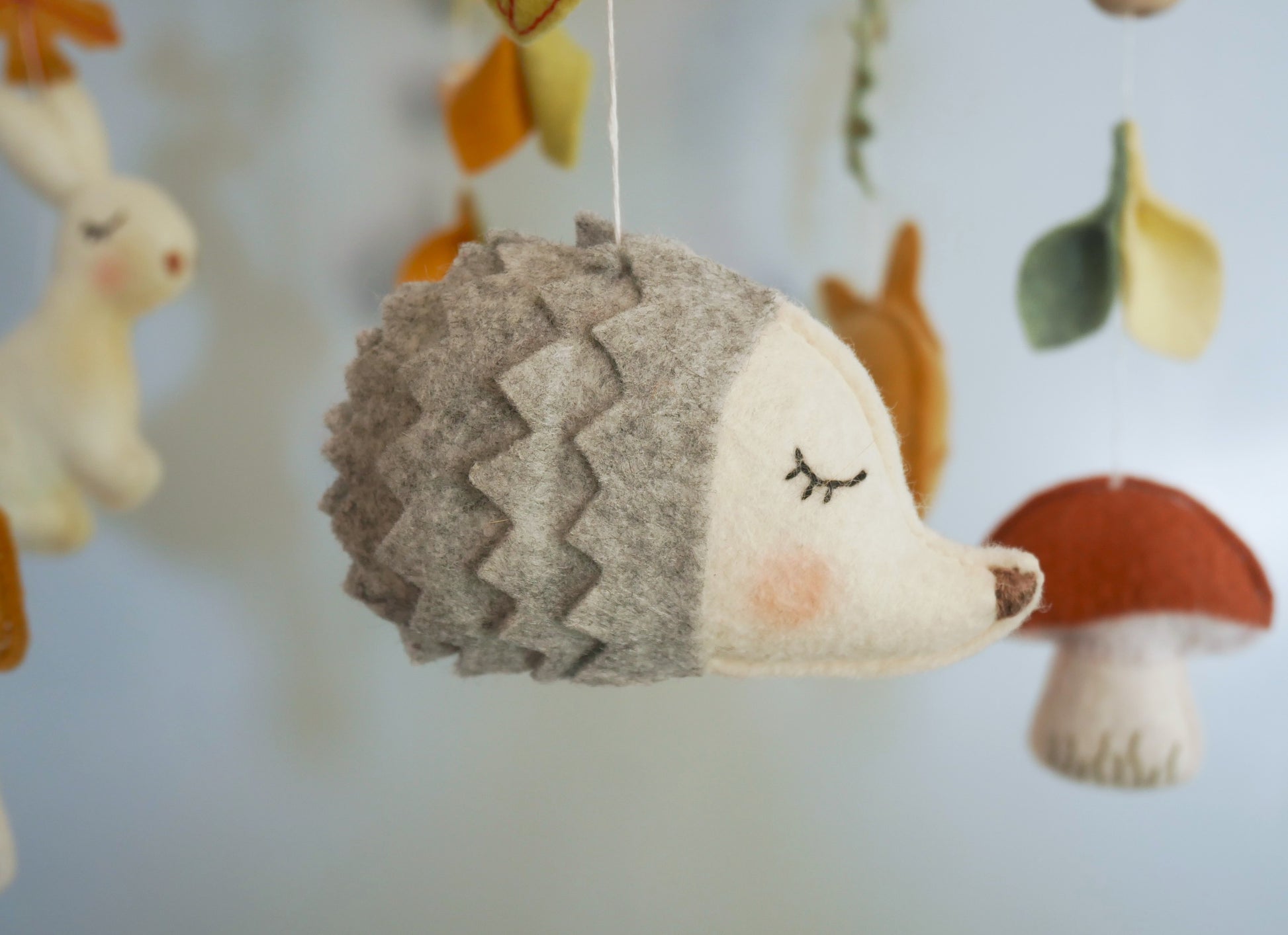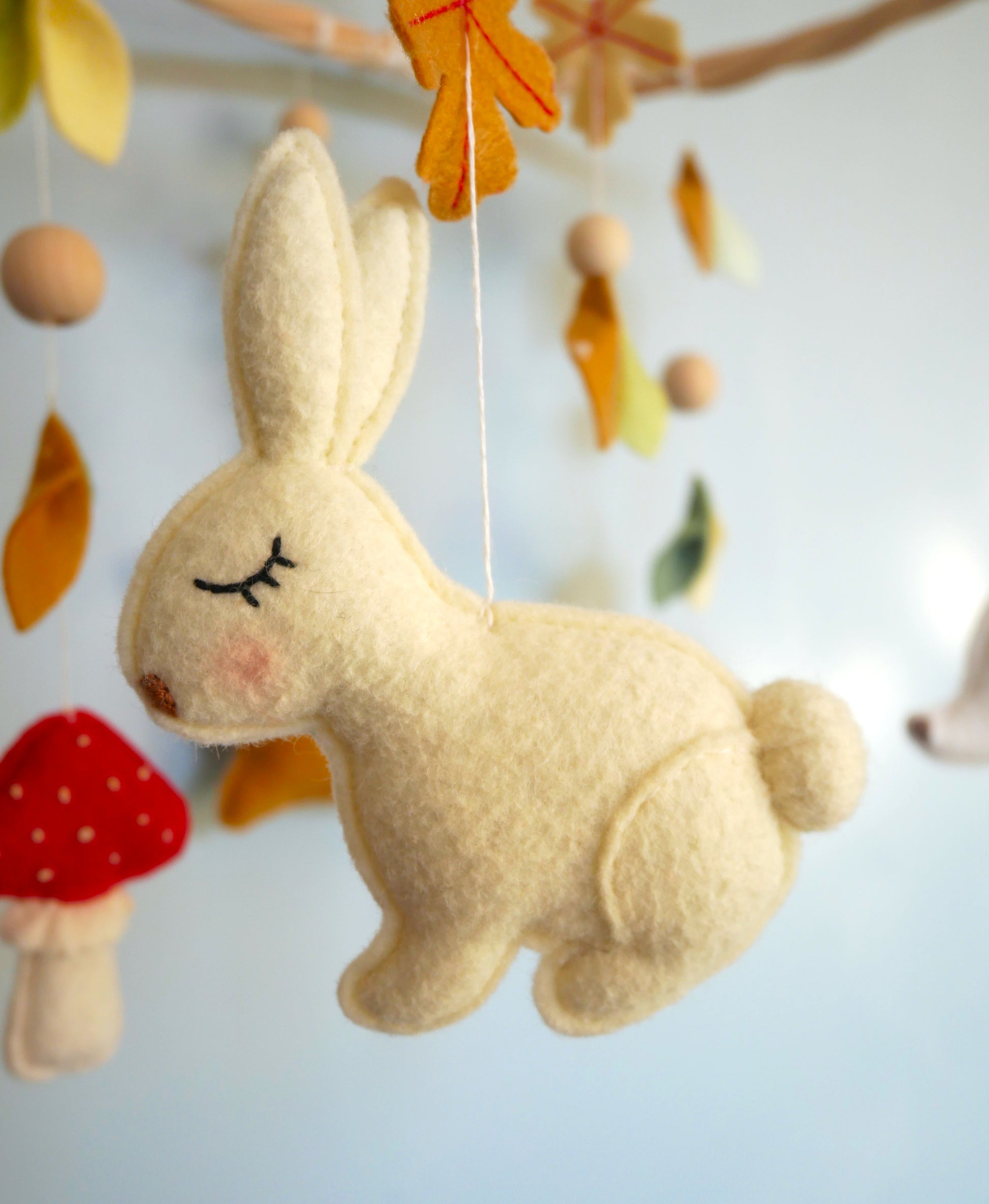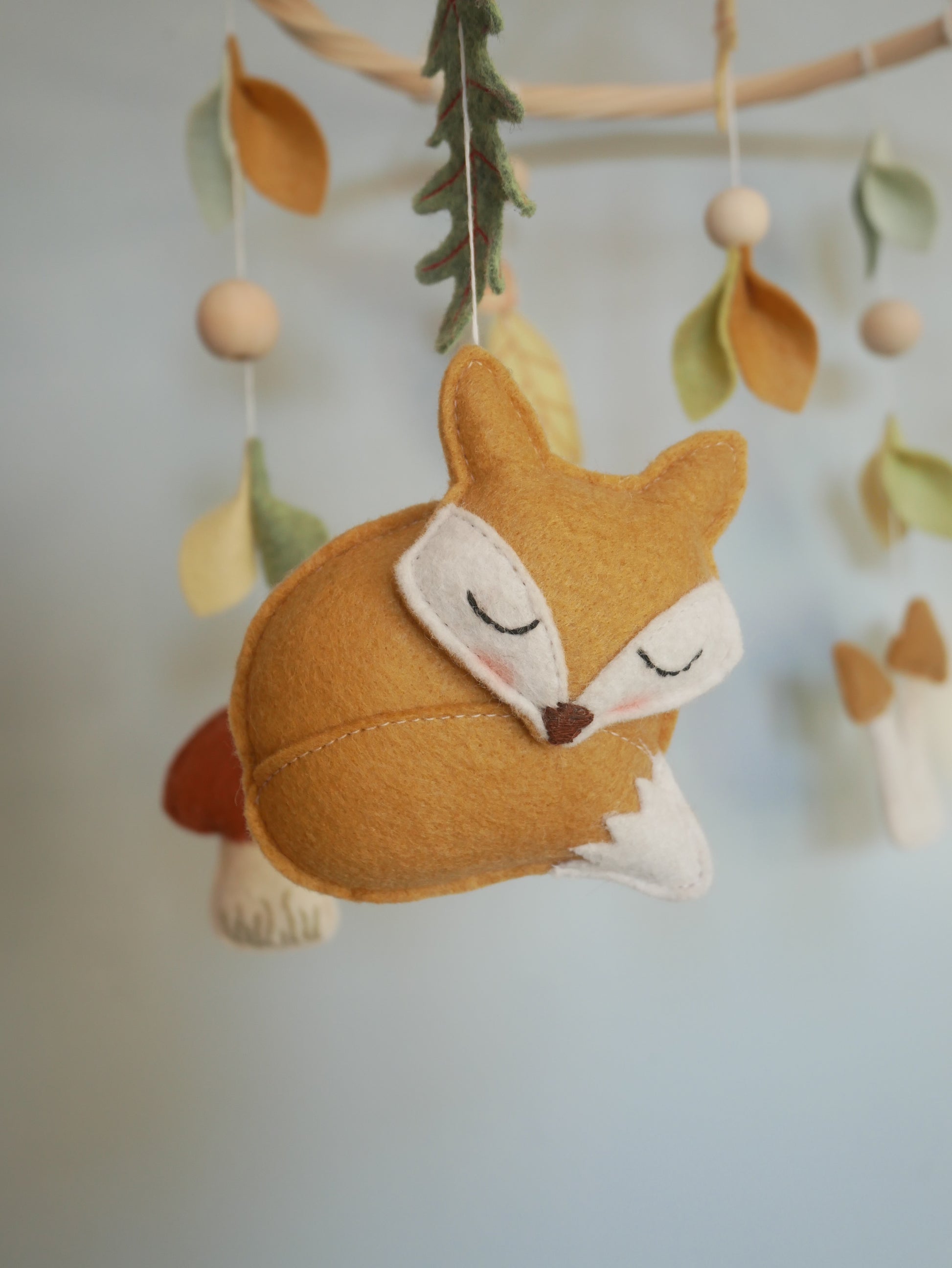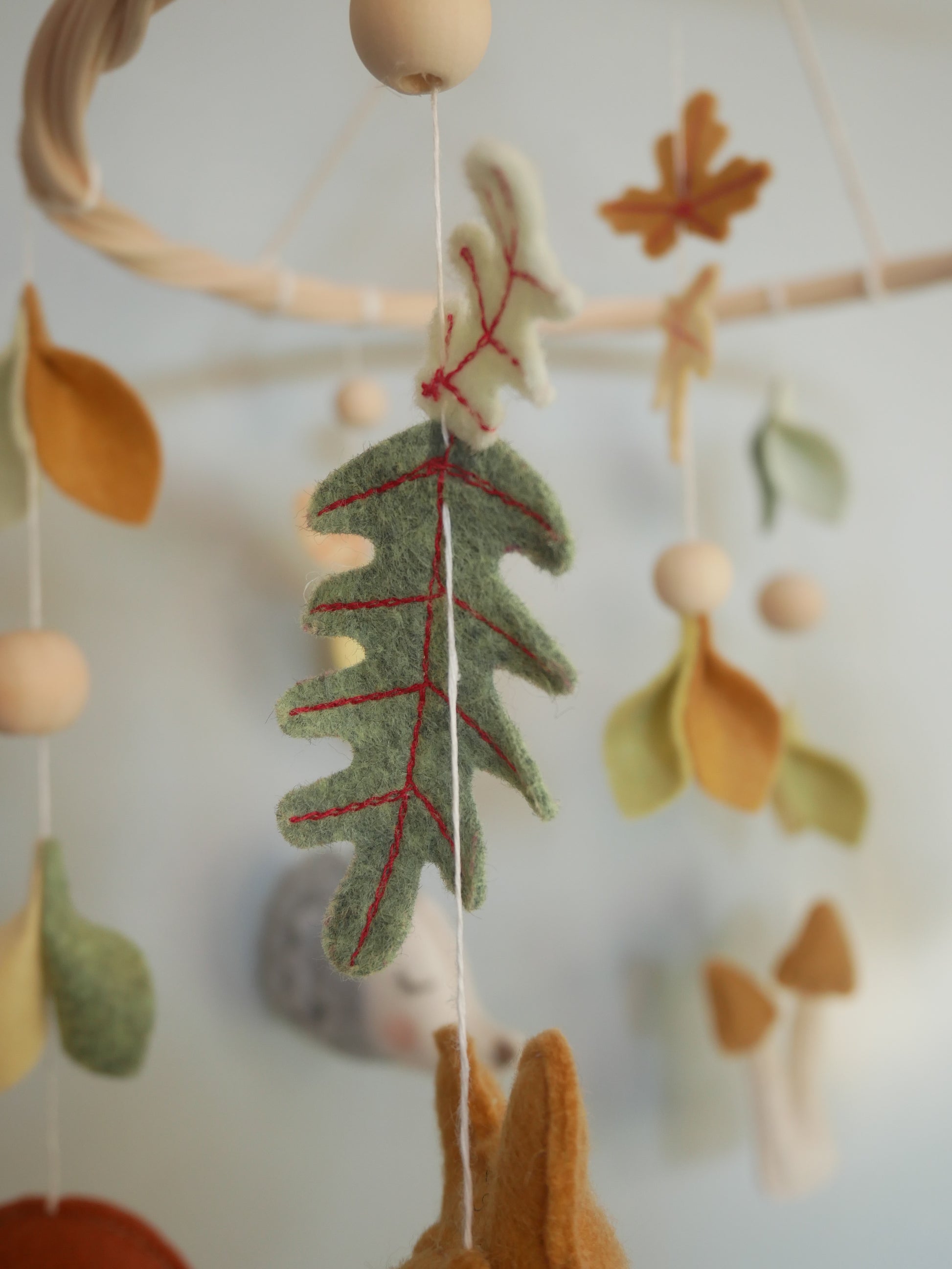 Mobile pour chambre de bébé. Fait main en feutrine et rotin sur le thème de la forêt et ses animaux. Les éléments suspendus, assemblés sur une structure en rotin naturel, créent un équilibre visuel apaisant au-dessus du lit ou de l'espace de change. Ce mobile stimule la curiosité visuelle du nourrisson tout en s'intégrant harmonieusement à une décoration douce et naturelle.