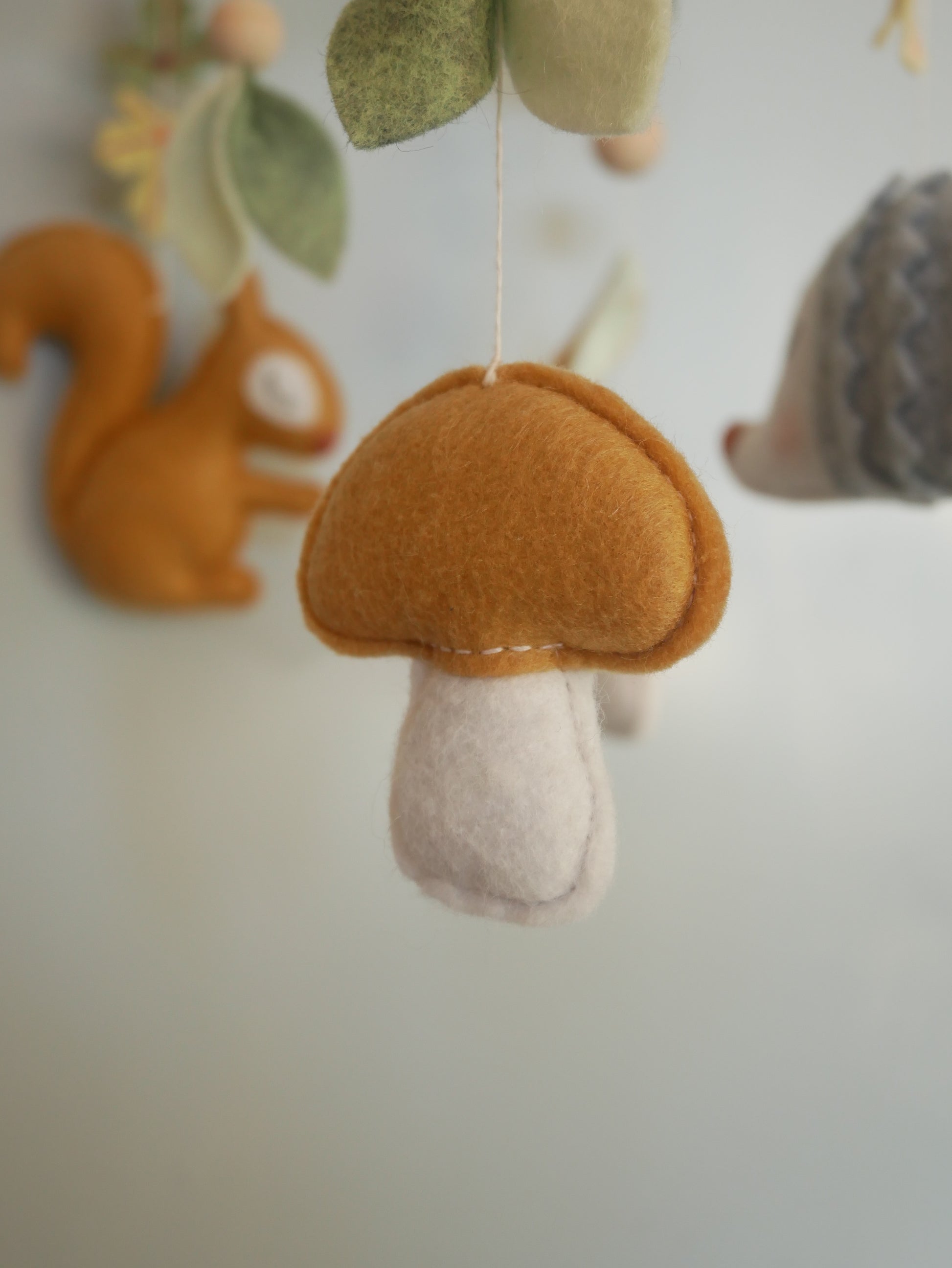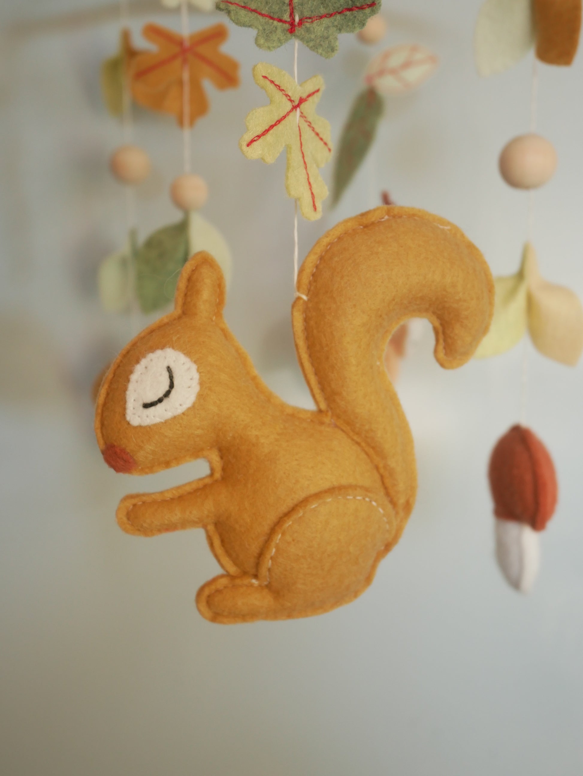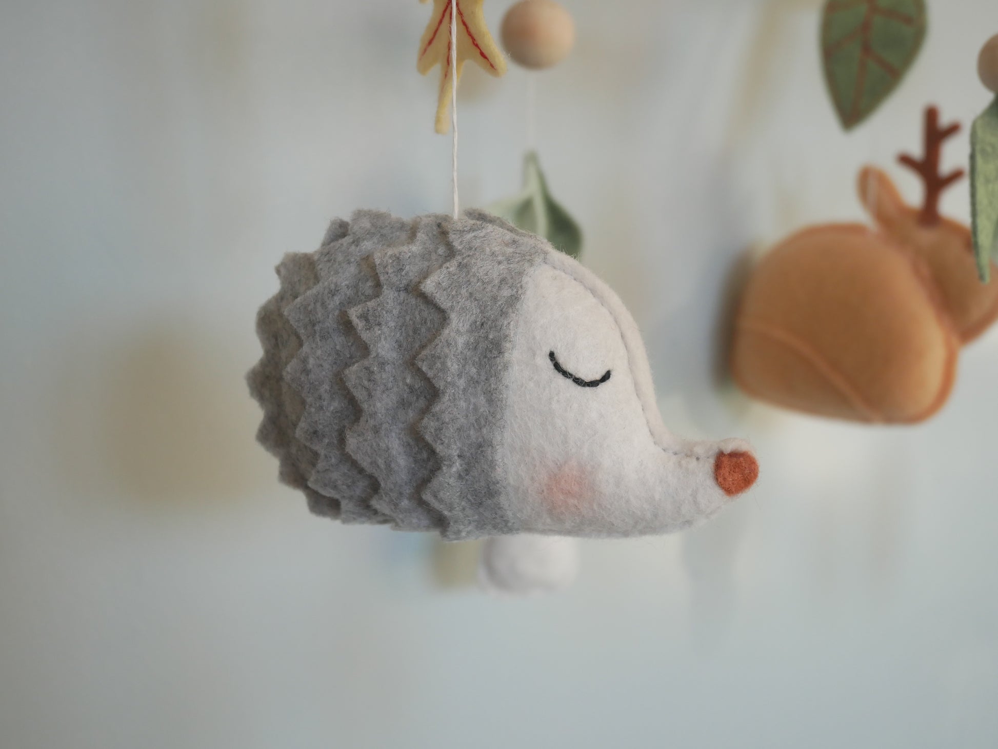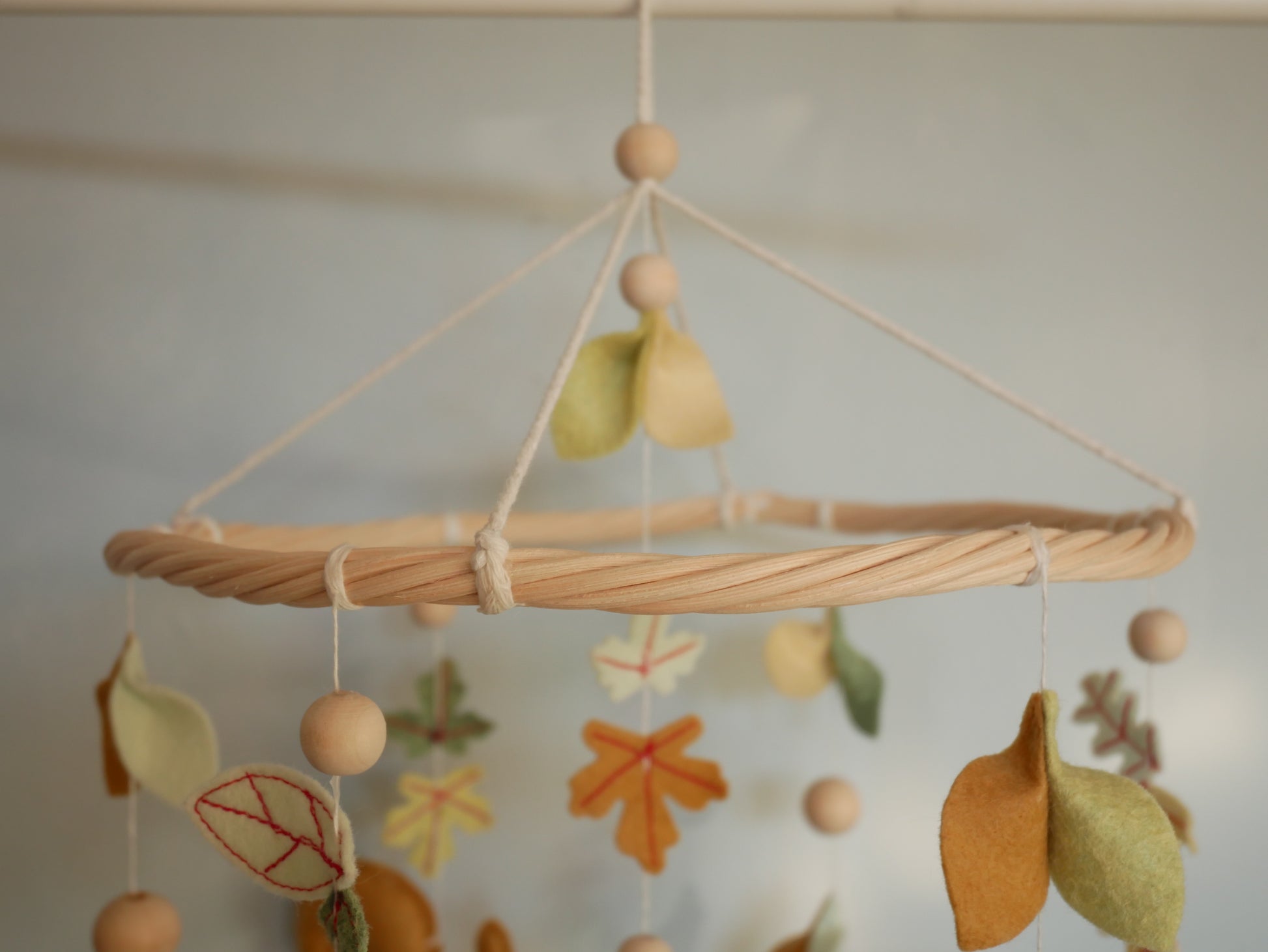 Mobile pour chambre de bébé. Fait main en feutrine et rotin sur le thème de la forêt et ses animaux. Les éléments suspendus, assemblés sur une structure en rotin naturel, créent un équilibre visuel apaisant au-dessus du lit ou de l'espace de change. Ce mobile stimule la curiosité visuelle du nourrisson tout en s'intégrant harmonieusement à une décoration douce et naturelle.