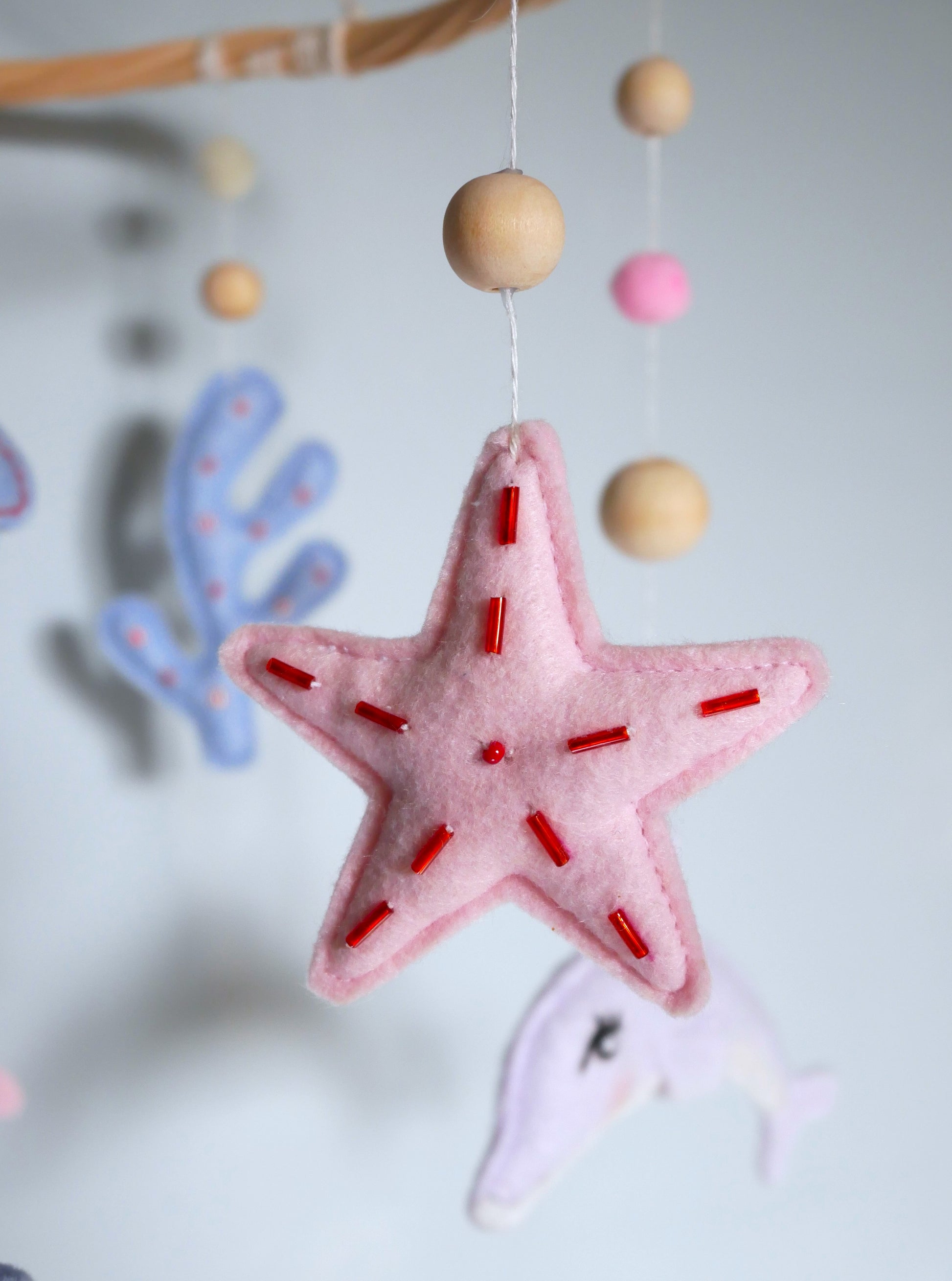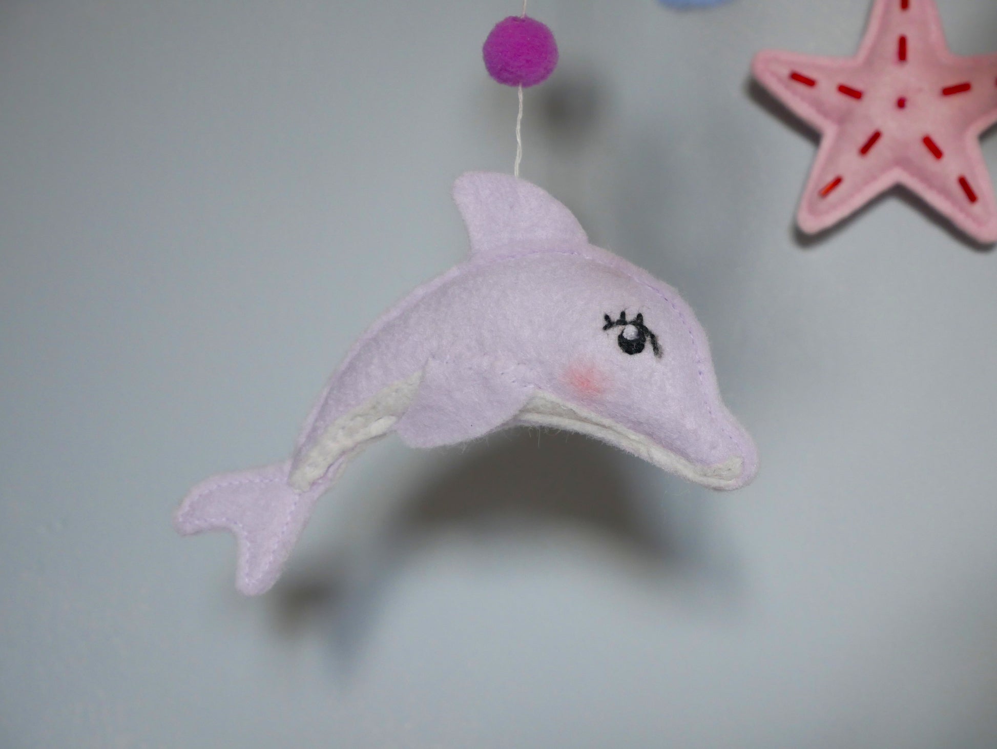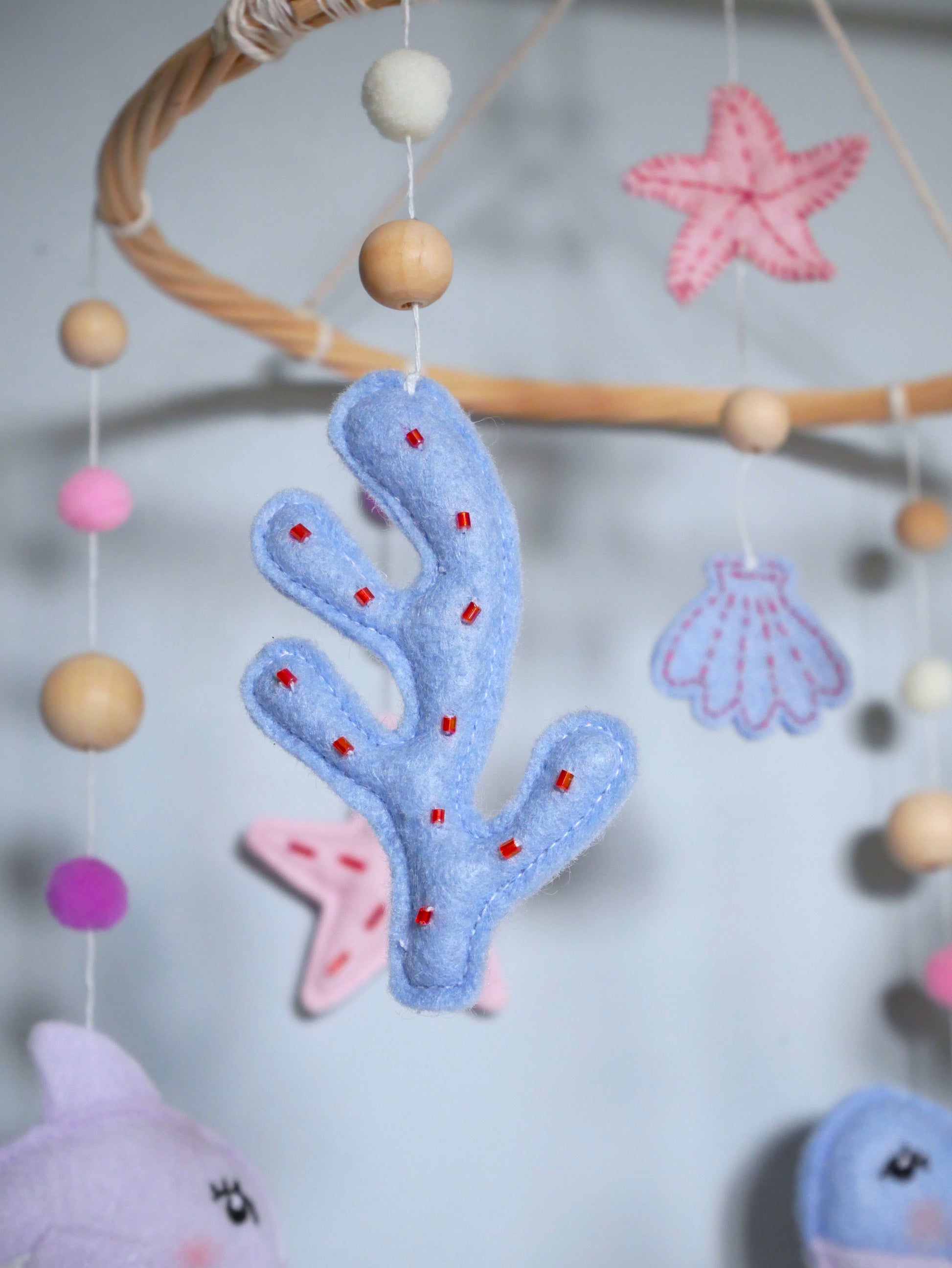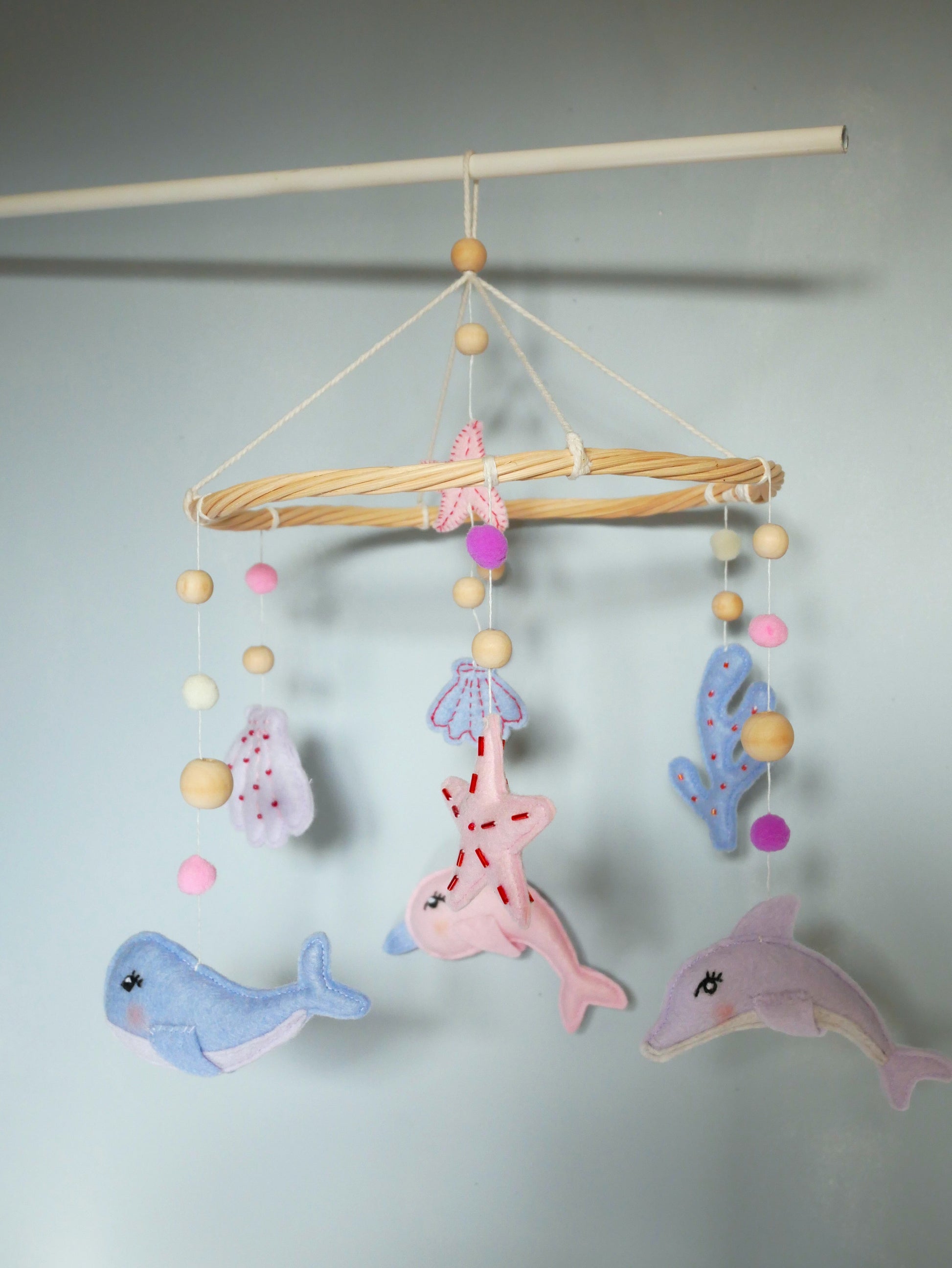 Mobile Bébé Dauphin Créez une atmosphère apaisante dans la chambre de votre enfant avec ce mobile artisanal aux teintes douces. Composé de créatures marines et coquillages en feutrine suspendues à une structure en rotin. Les nuances de bleu et rose harmonieuses stimulent doucement la vision du nourrisson tout en créant un environnement visuel serein. Parfait pour accompagner les premiers mois de bébé avec tendresse.