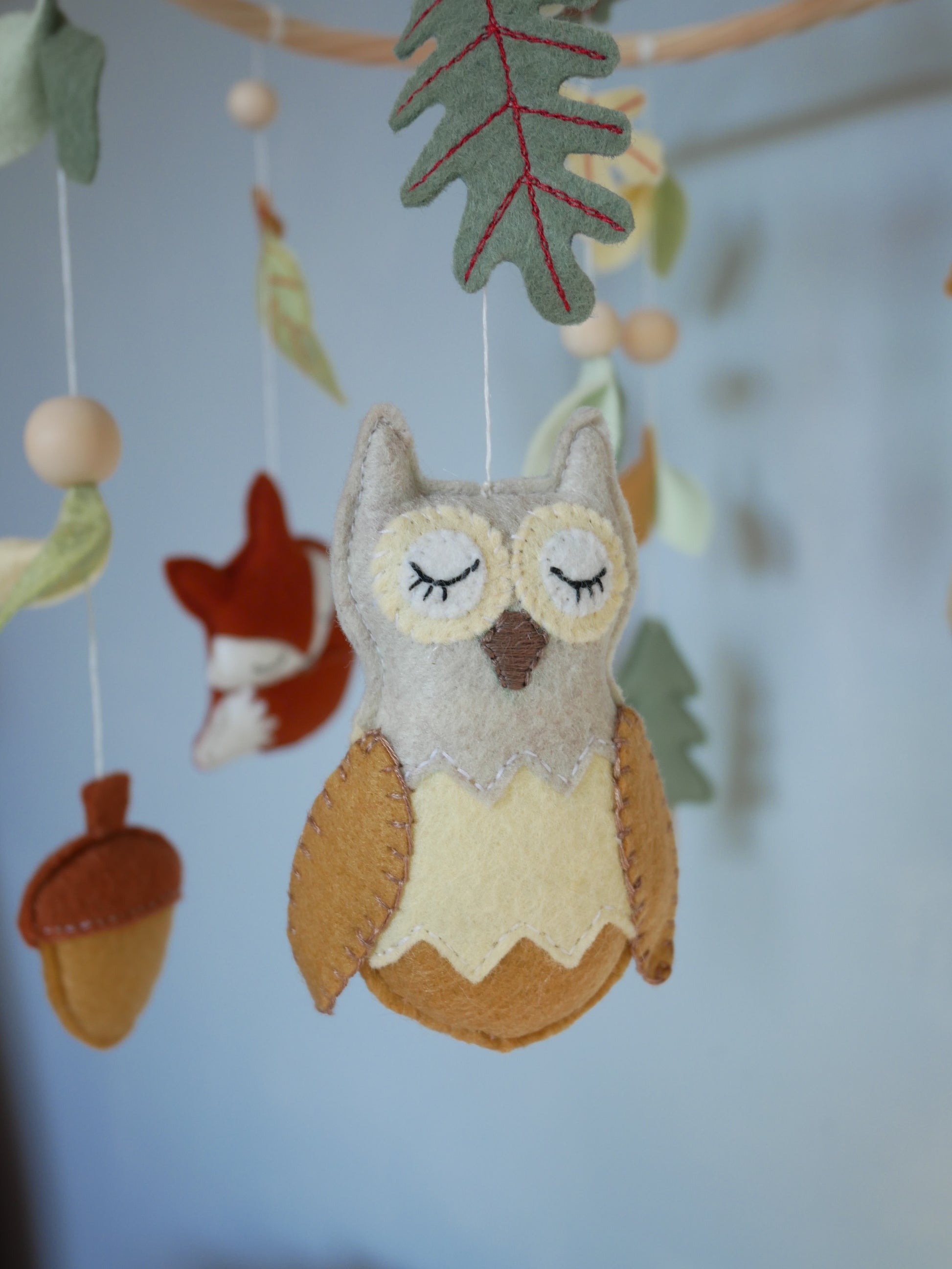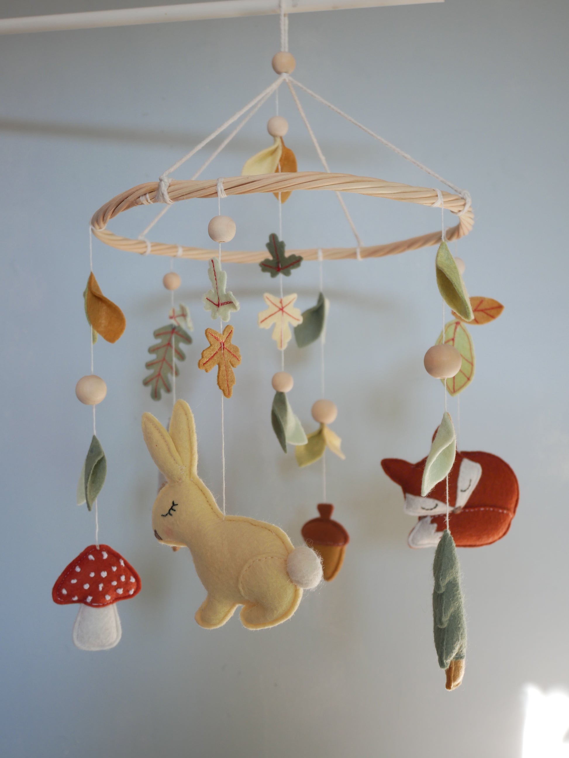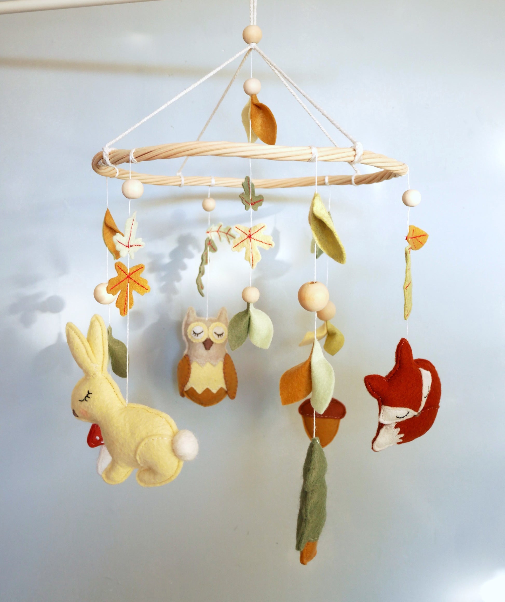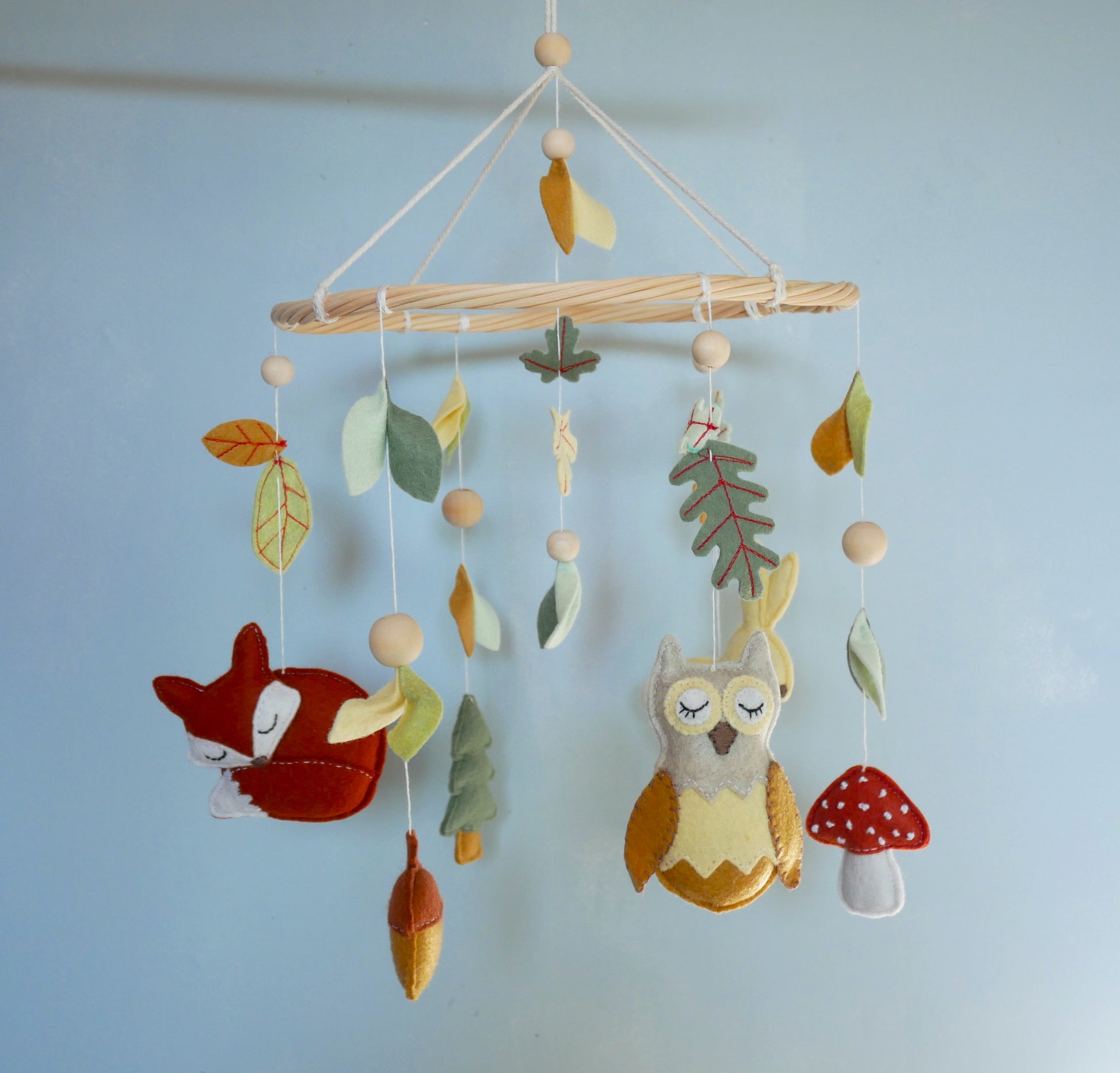Mobile pour chambre de bébé. Fait main en feutrine et rotin sur le thème de la forêt, chouette et autre créature des bois. Les éléments suspendus, assemblés sur une structure en rotin naturel, créent un équilibre visuel apaisant au-dessus du lit ou de l'espace de change. Ce mobile stimule la curiosité visuelle du nourrisson tout en s'intégrant harmonieusement à une décoration douce et naturelle.