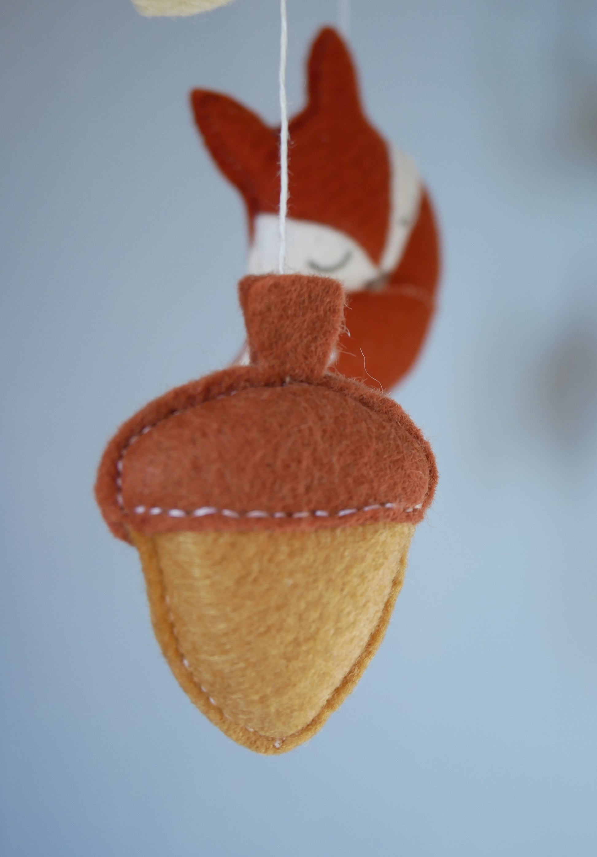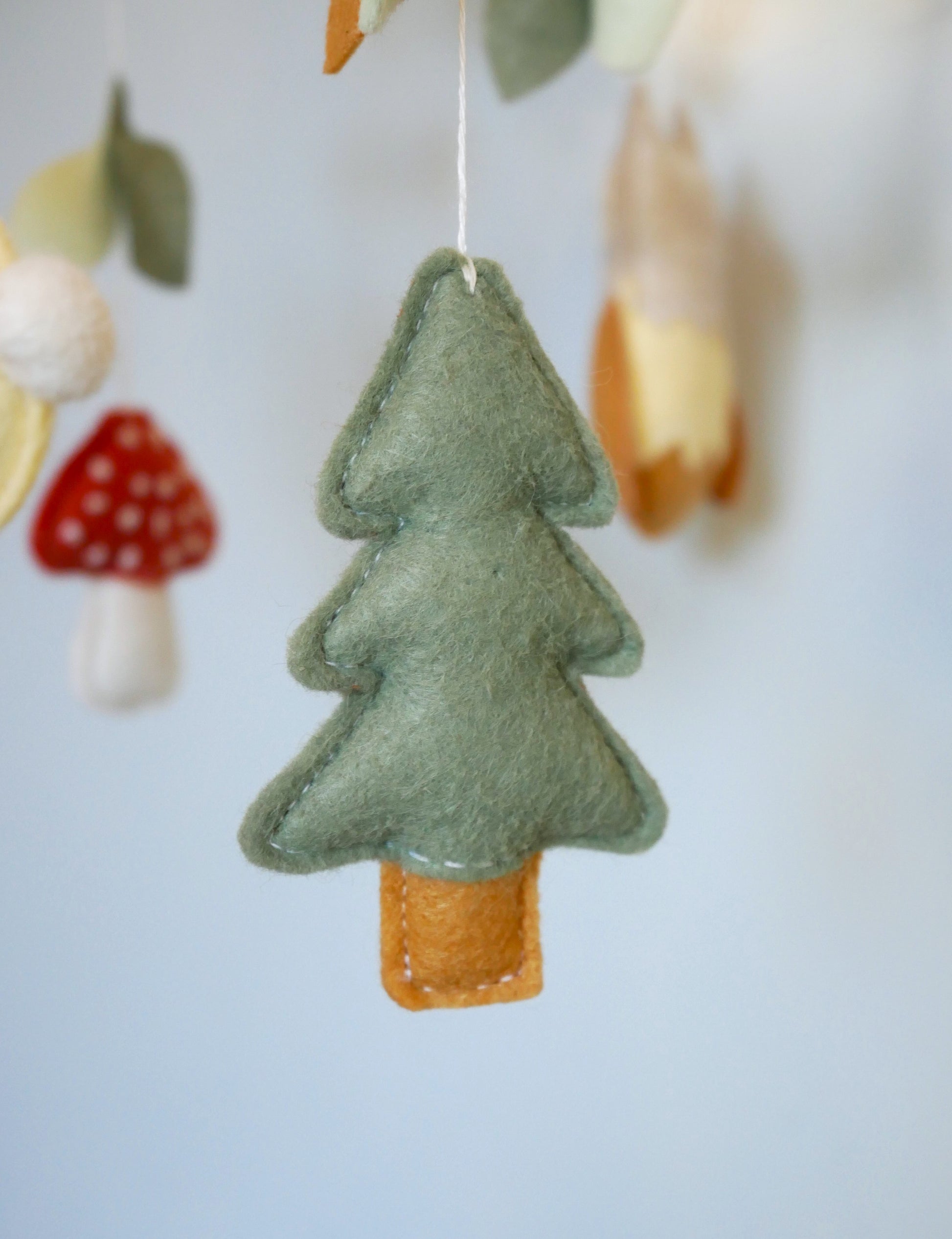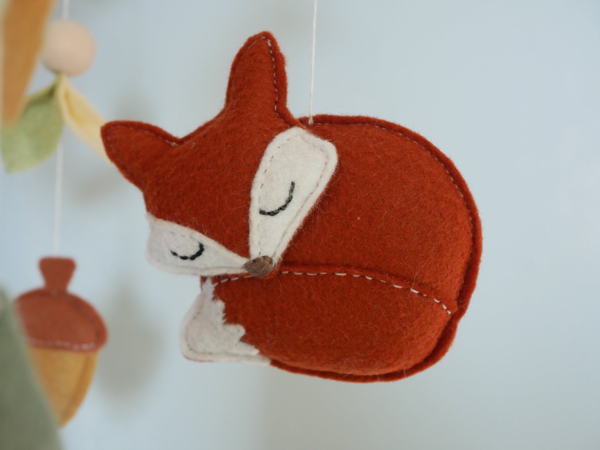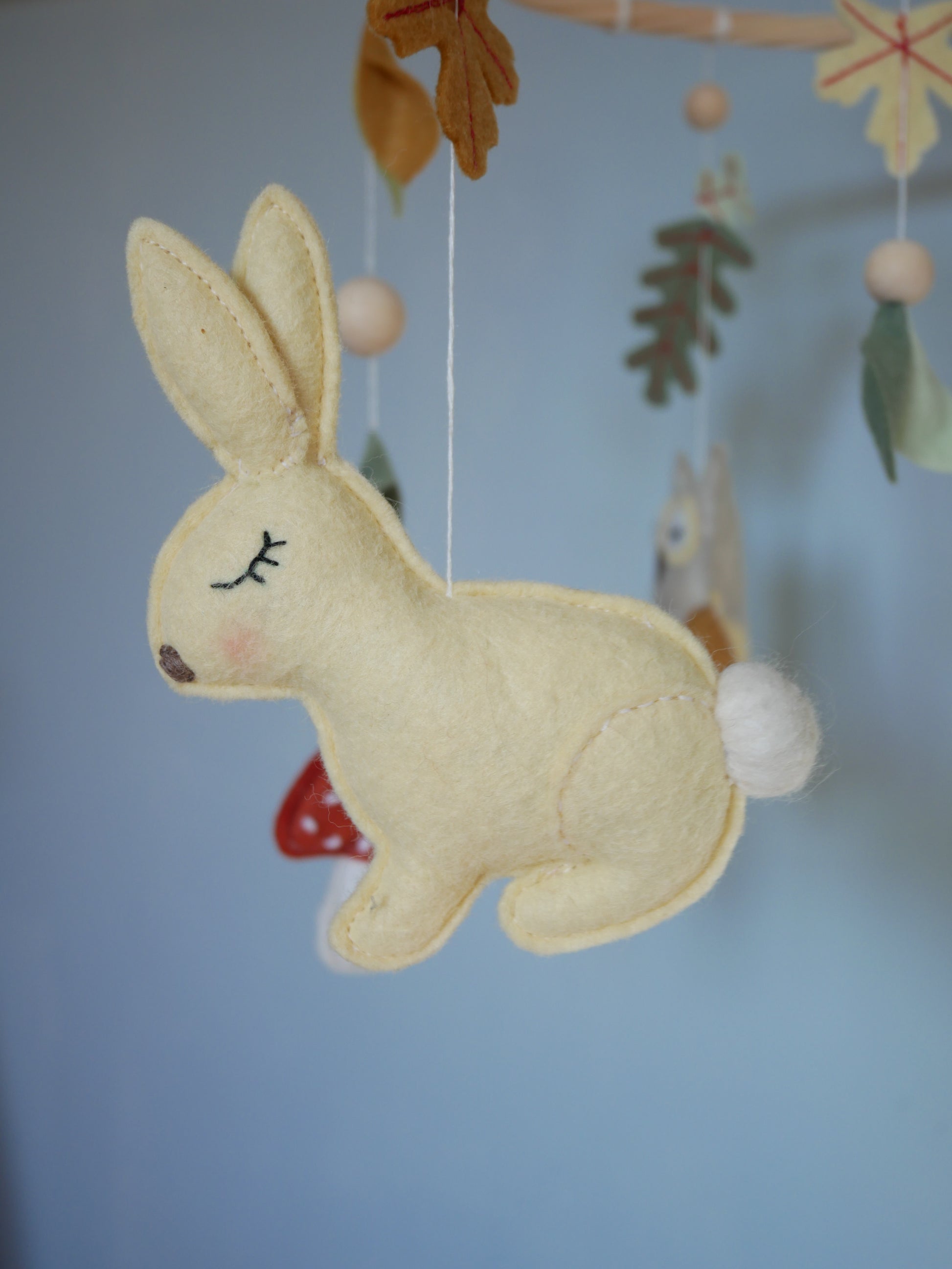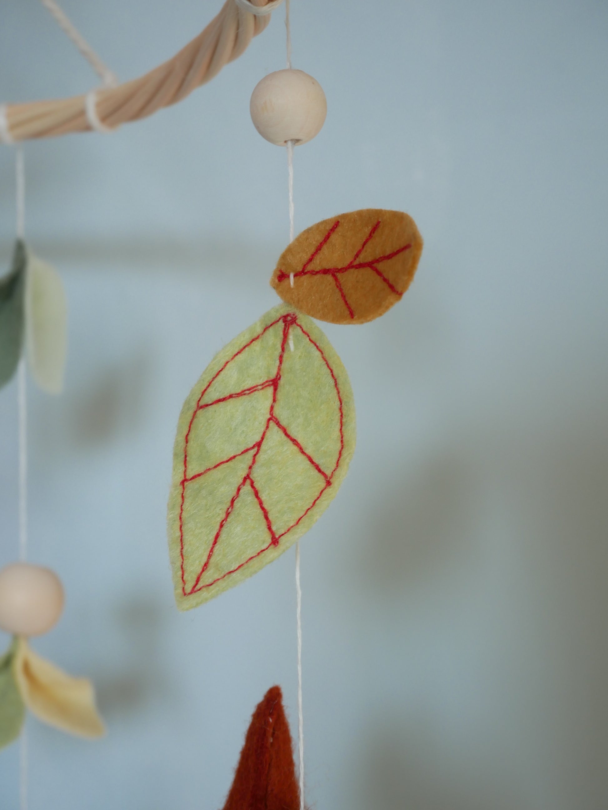 Mobile pour chambre de bébé. Fait main en feutrine et rotin sur le thème de la forêt, chouette et autre créature des bois. Les éléments suspendus, assemblés sur une structure en rotin naturel, créent un équilibre visuel apaisant au-dessus du lit ou de l'espace de change. Ce mobile stimule la curiosité visuelle du nourrisson tout en s'intégrant harmonieusement à une décoration douce et naturelle.