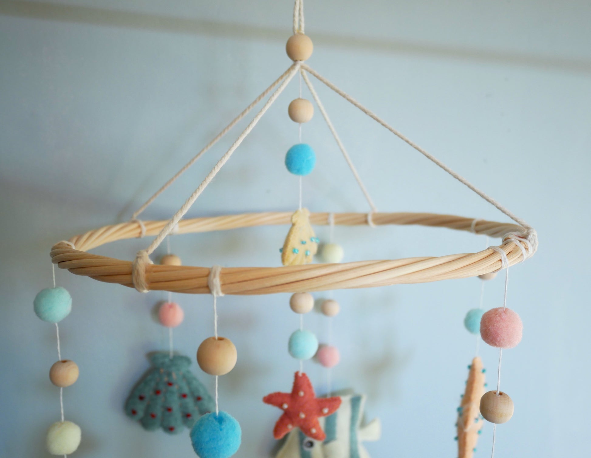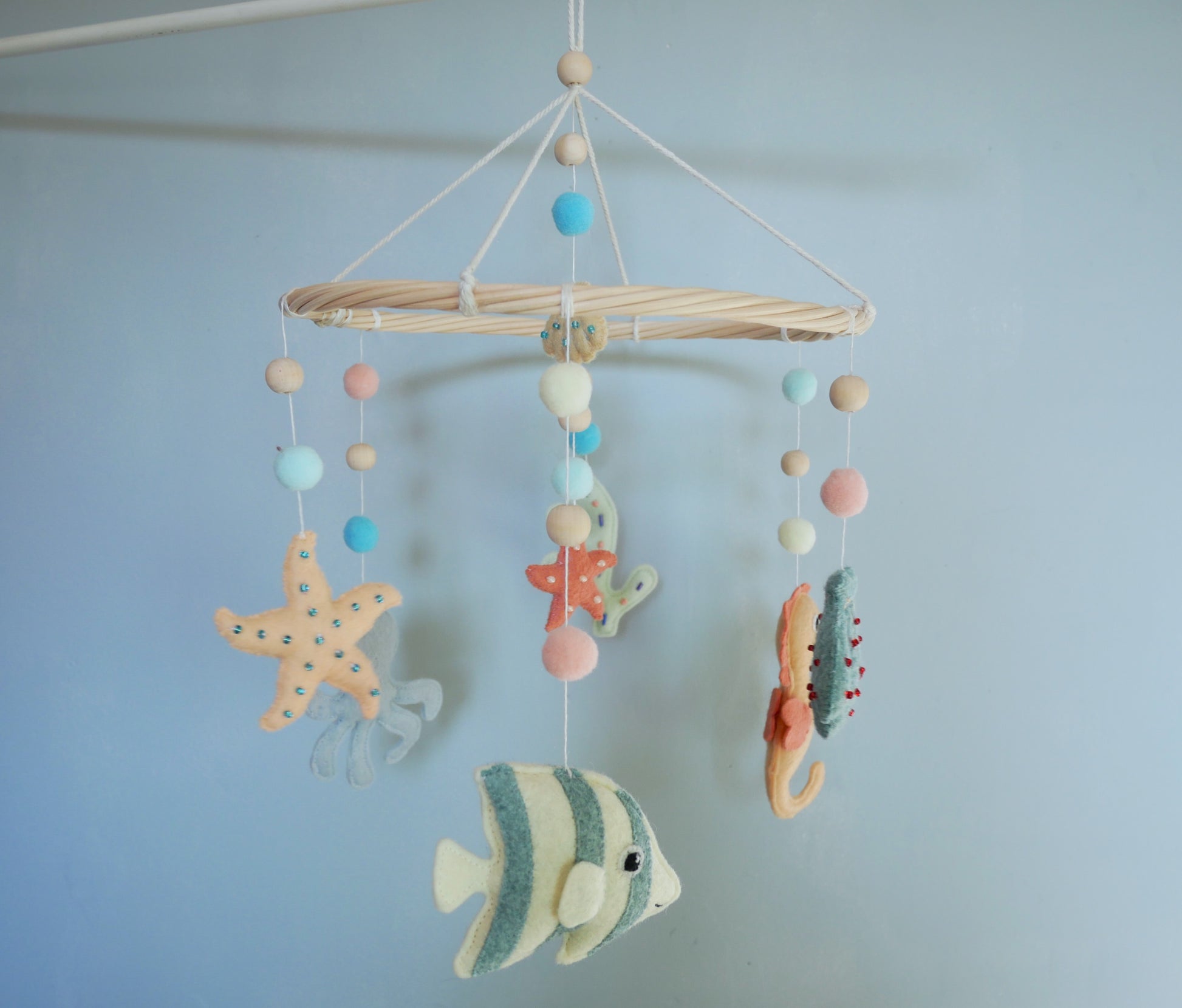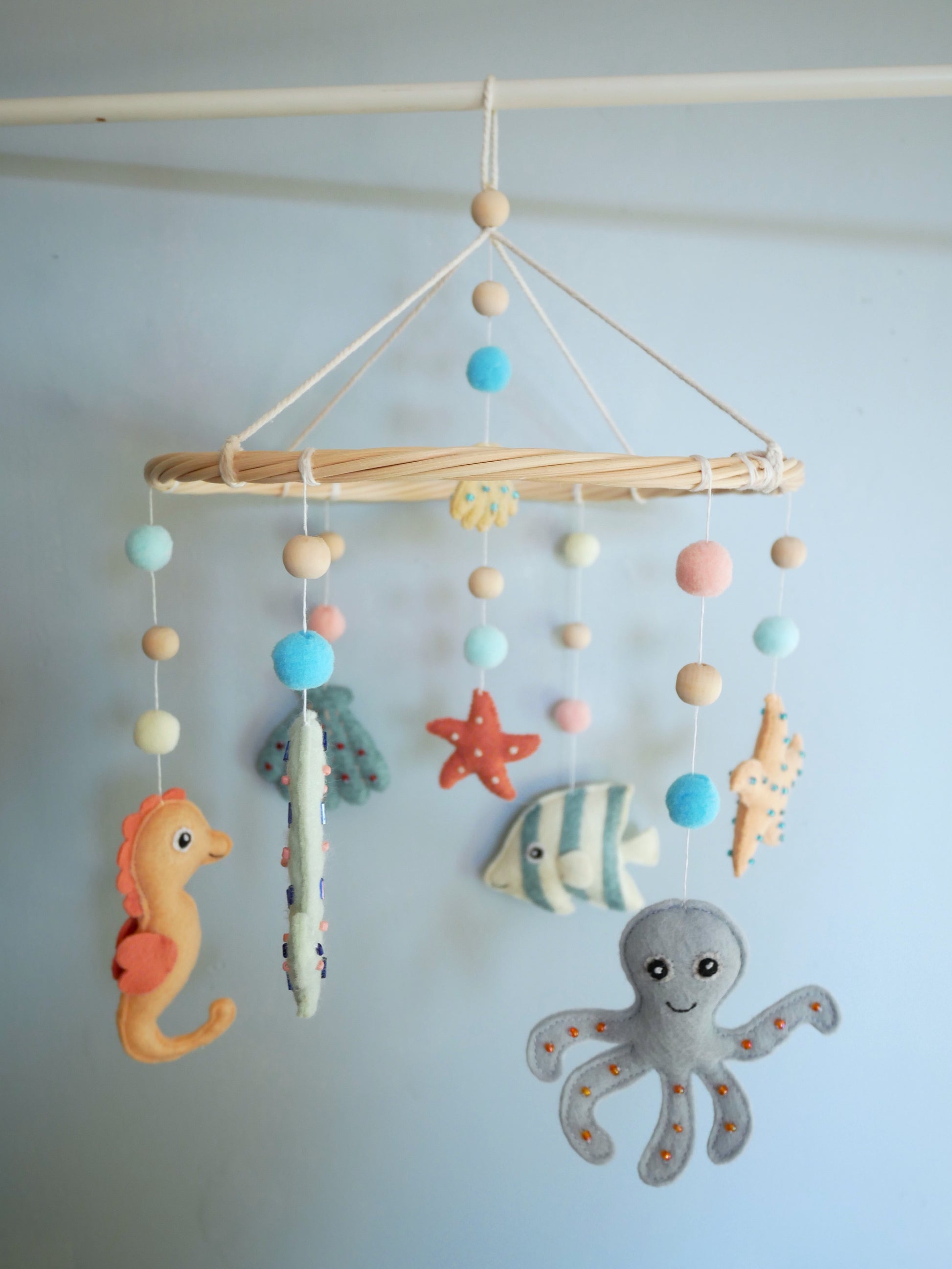 Mobile bébé aux motifs marins fait main, orné de poissons colorés et de coquillages en feutrine brodés de perles. La structure en rotin naturel offre légèreté et durabilité. Idéal pour stimuler la curiosité visuelle du nourrisson. Parfait pour créer une atmosphère apaisante dans la chambre de bébé.