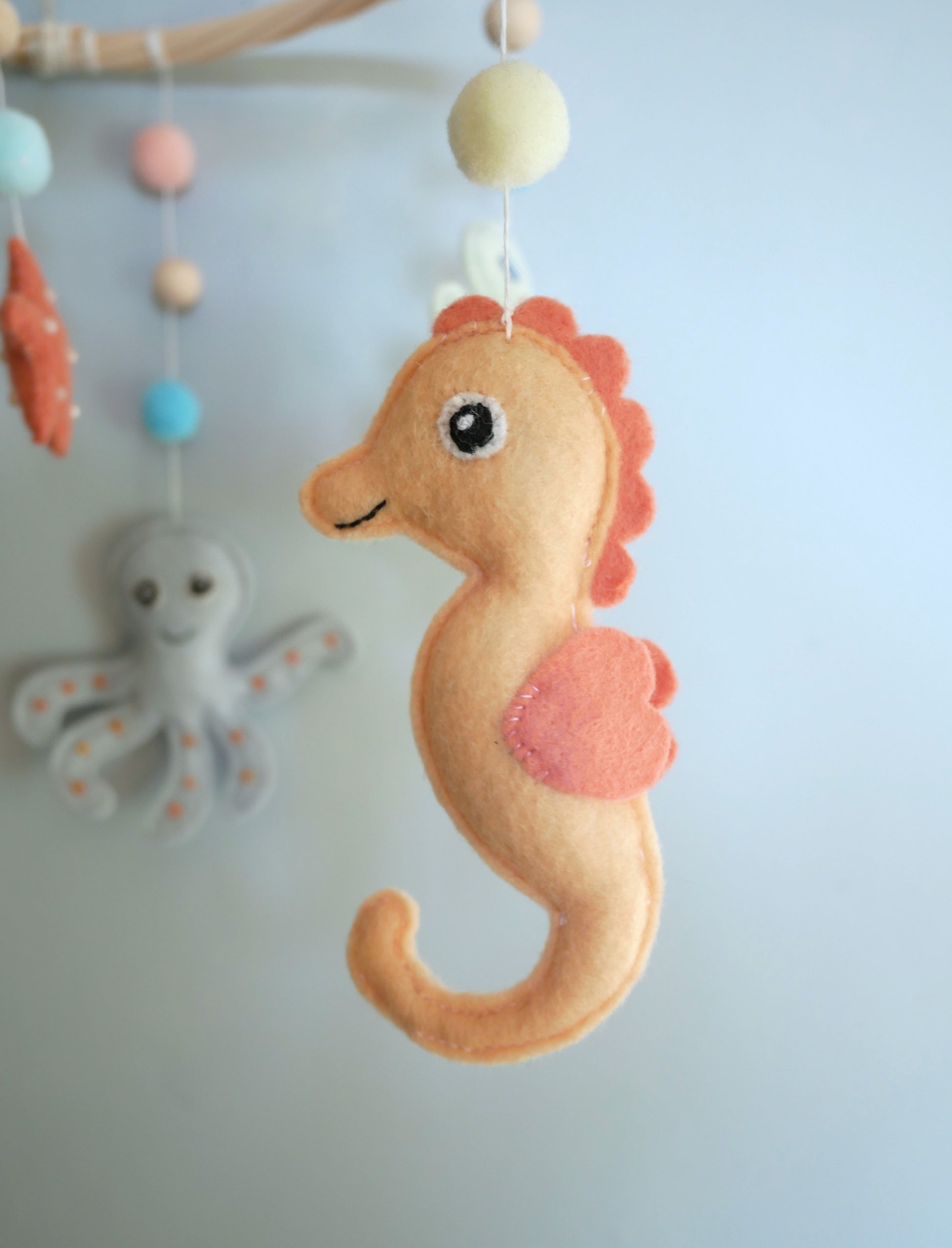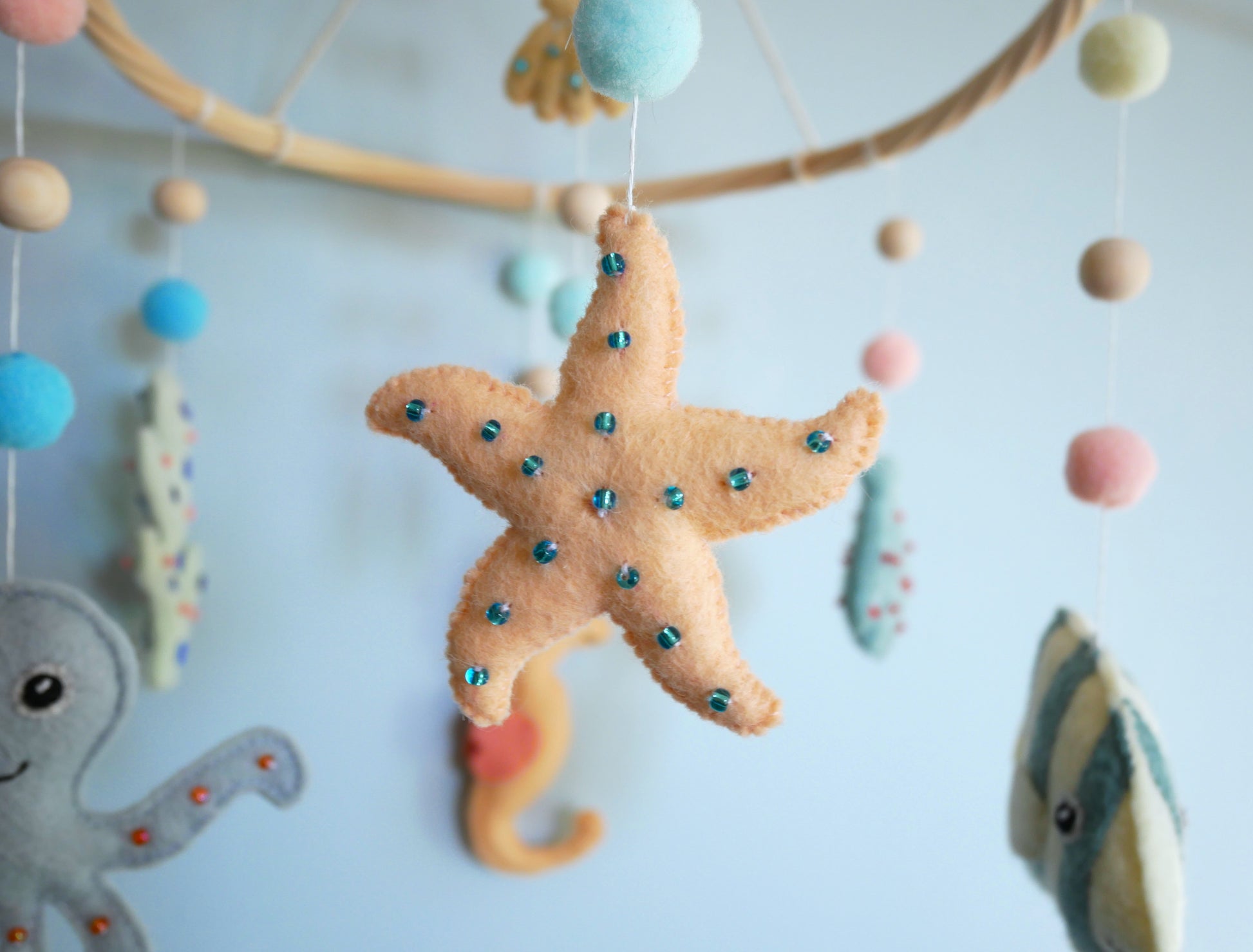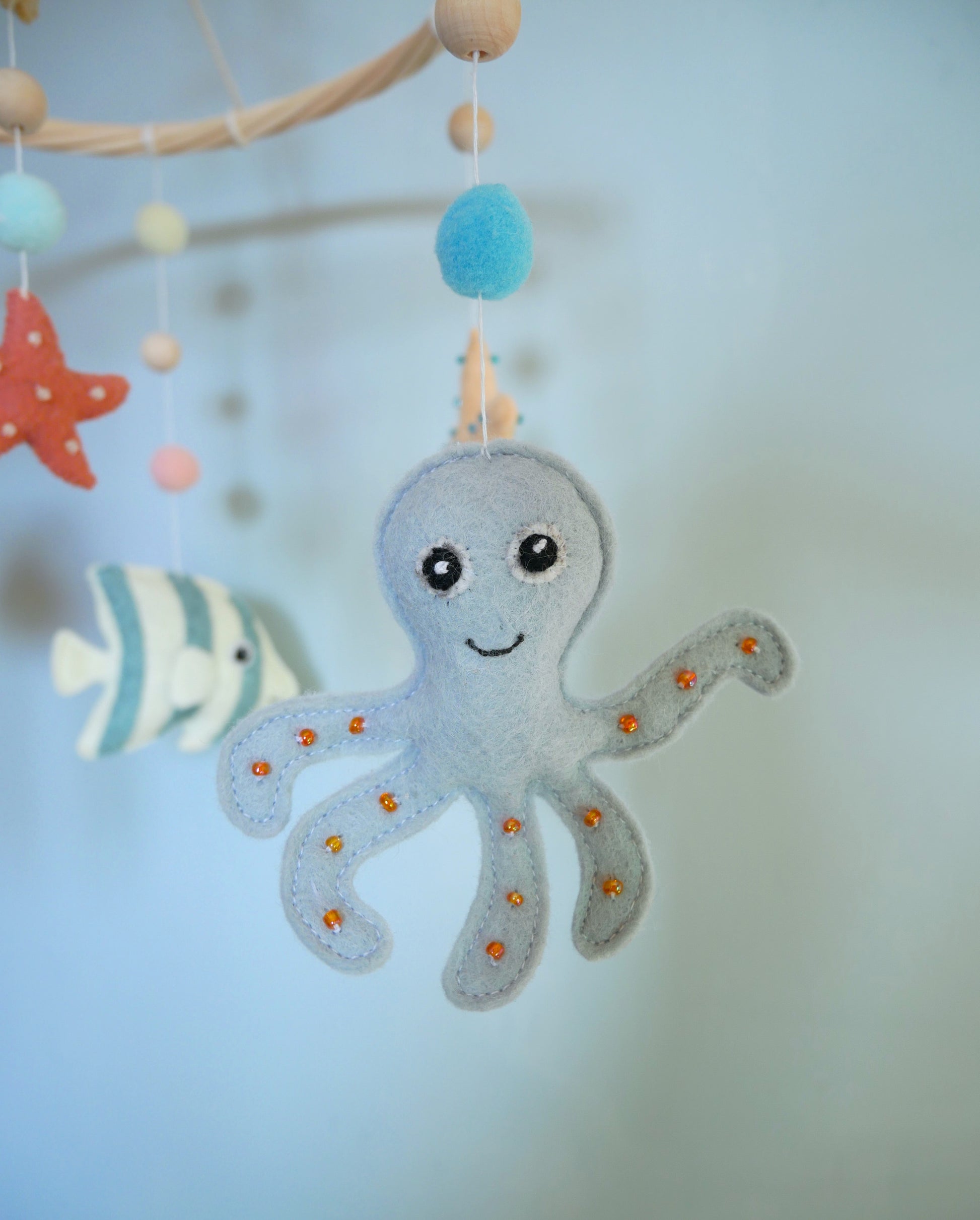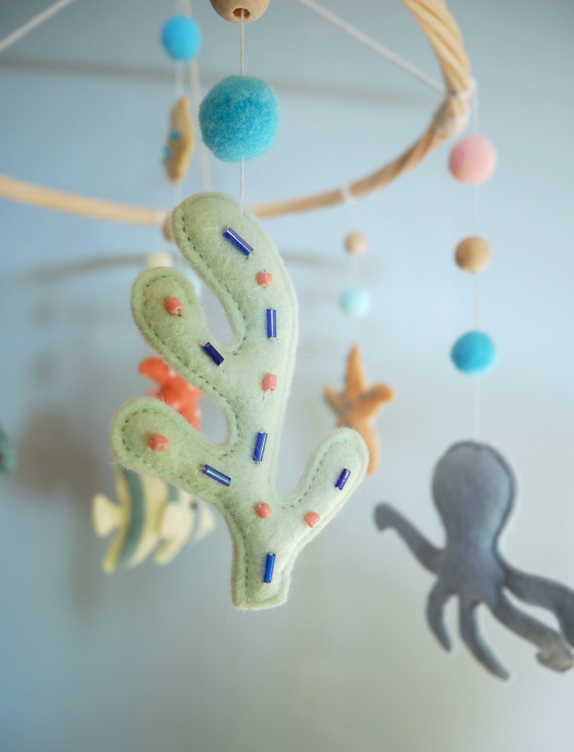 Mobile bébé aux motifs marins fait main, orné de poissons colorés et de coquillages en feutrine brodés de perles. La structure en rotin naturel offre légèreté et durabilité. Idéal pour stimuler la curiosité visuelle du nourrisson. Parfait pour créer une atmosphère apaisante dans la chambre de bébé.