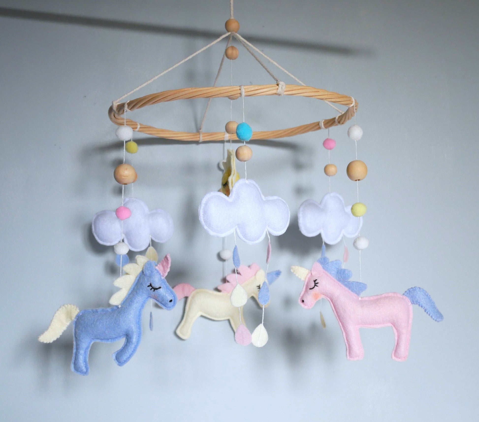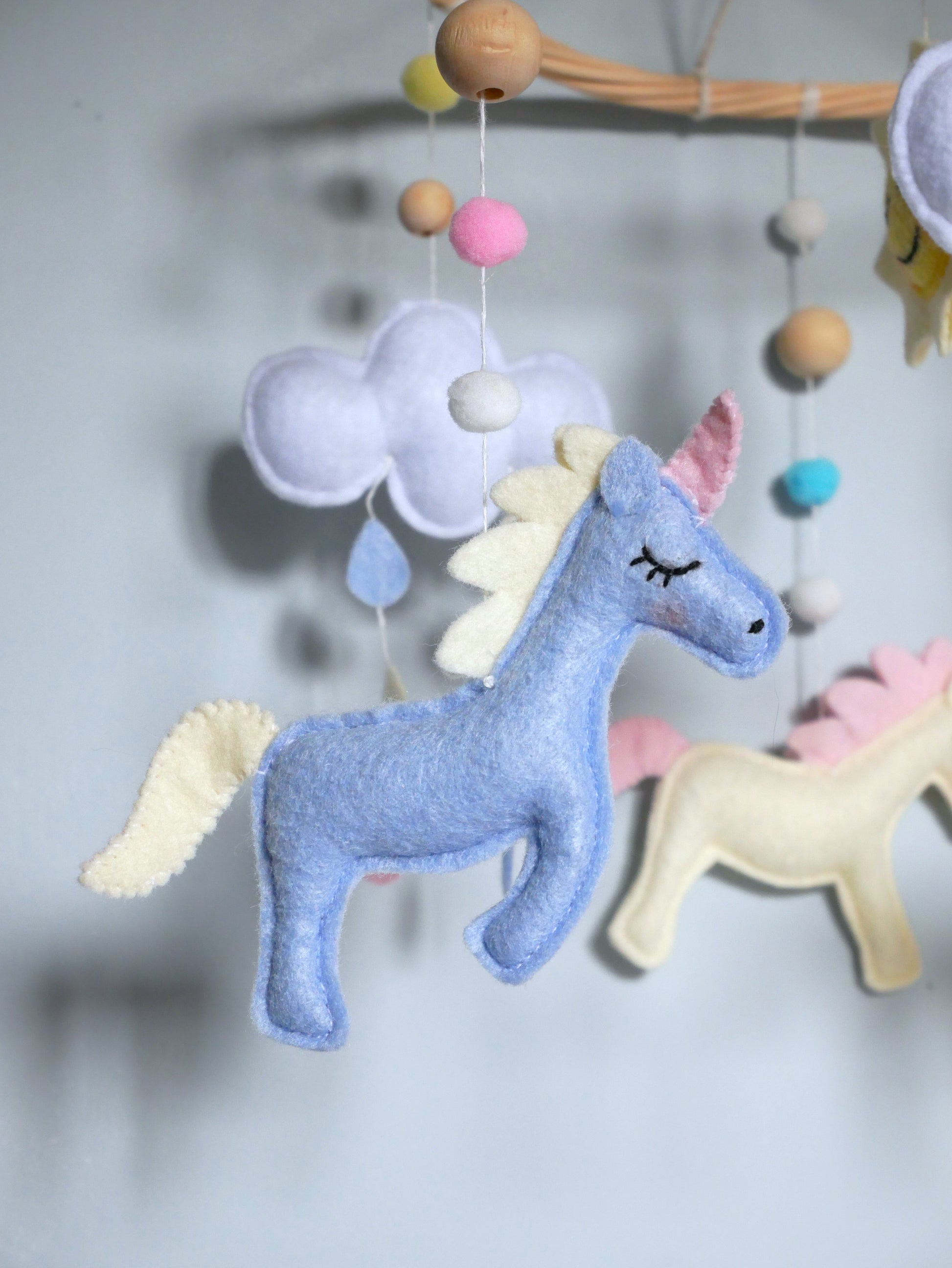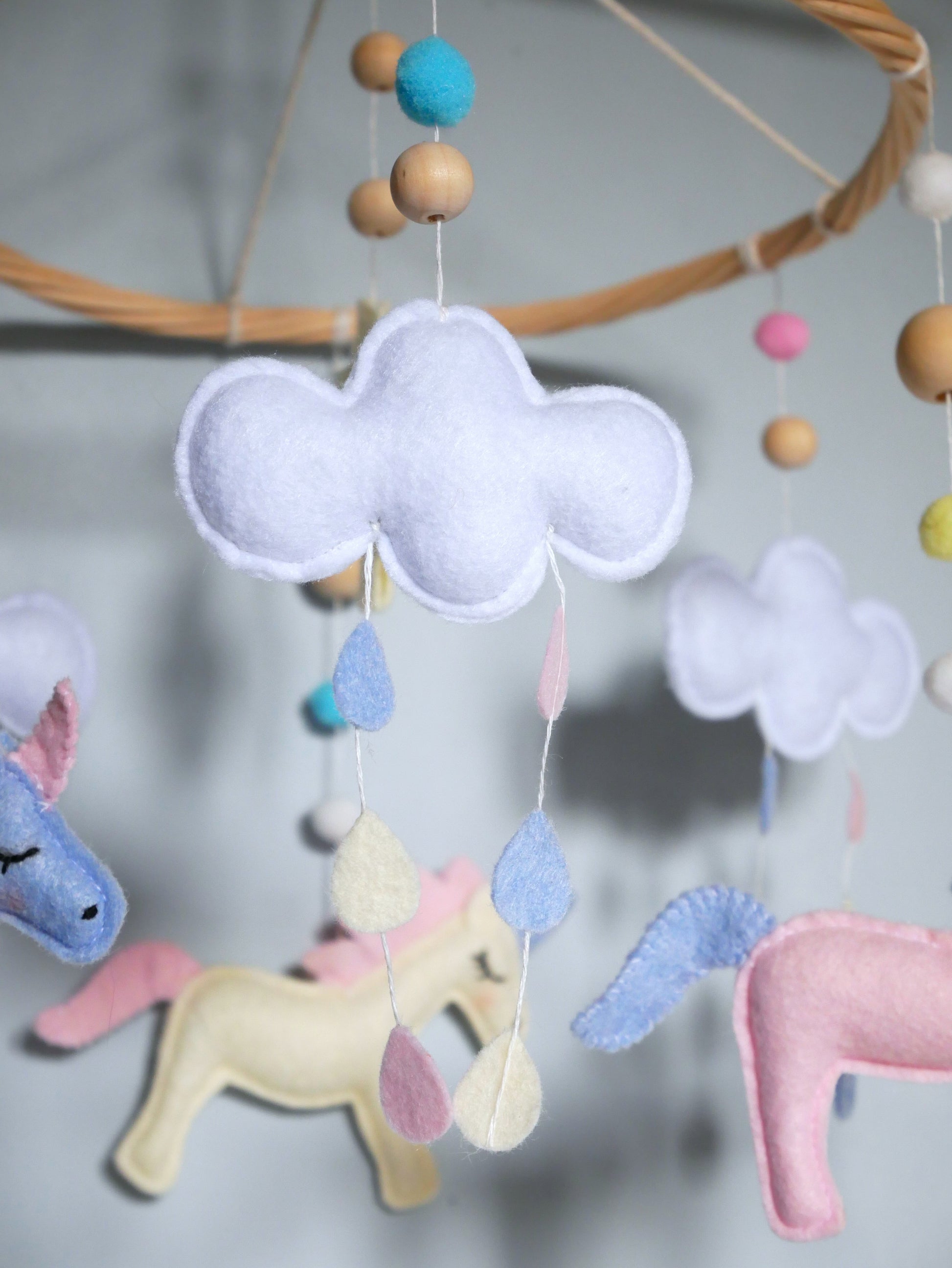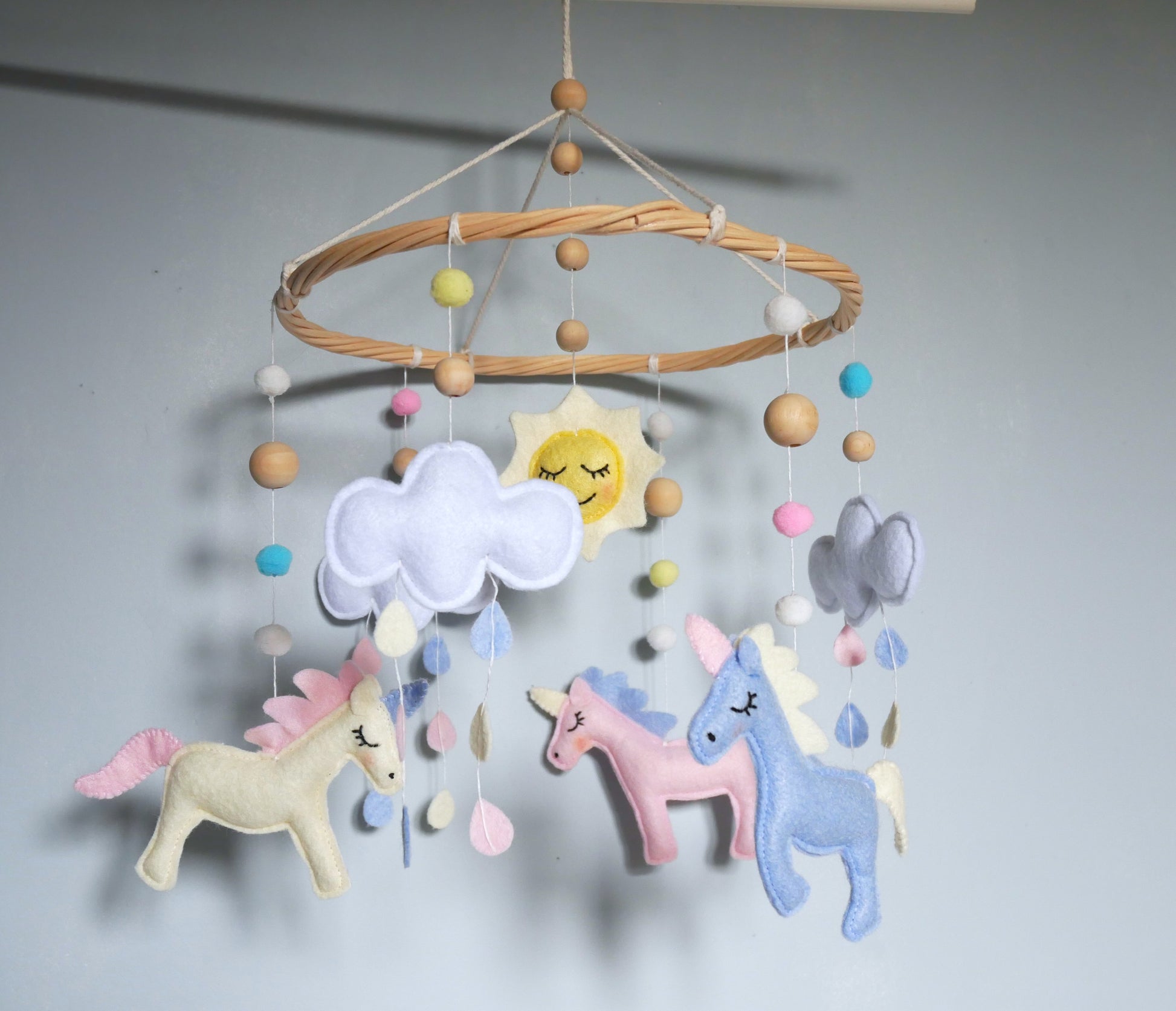 Mobile bébé réalisé à la main, associant feutrine douce et rotin naturel pour créer un univers céleste enchanteur. Les licornes flottent parmi les nuages dans un ciel aux teintes apaisantes. Une création artisanale qui transforme la chambre en sanctuaire de douceur et de rêverie.