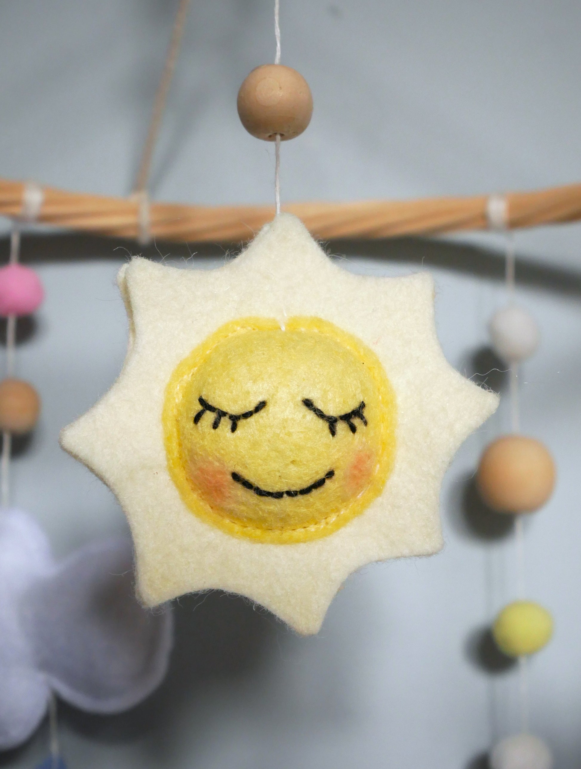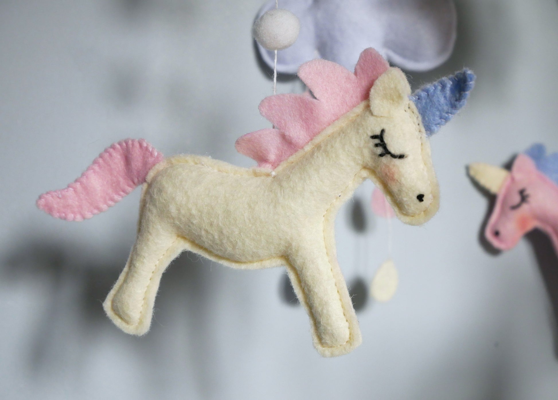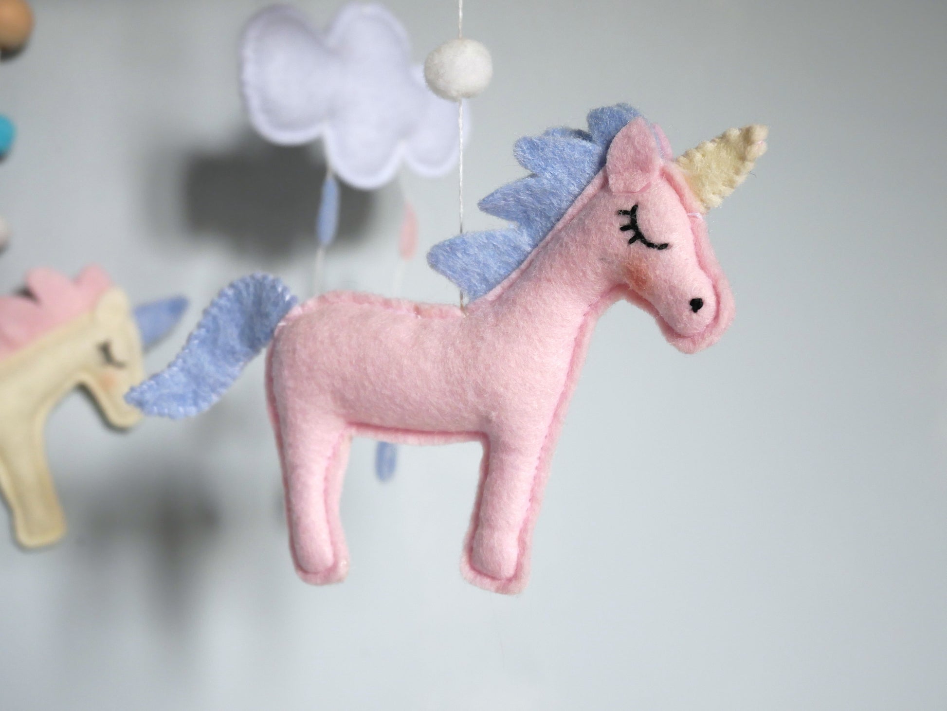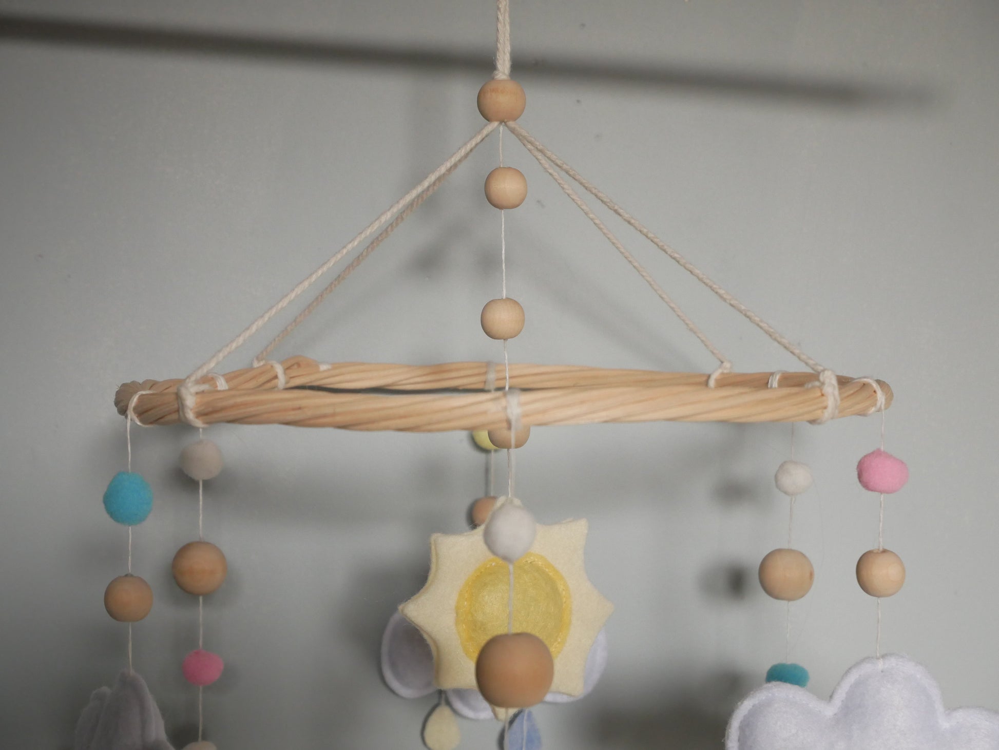 Mobile bébé réalisé à la main, associant feutrine douce et rotin naturel pour créer un univers céleste enchanteur. Les licornes flottent parmi les nuages dans un ciel aux teintes apaisantes. Une création artisanale qui transforme la chambre en sanctuaire de douceur et de rêverie.